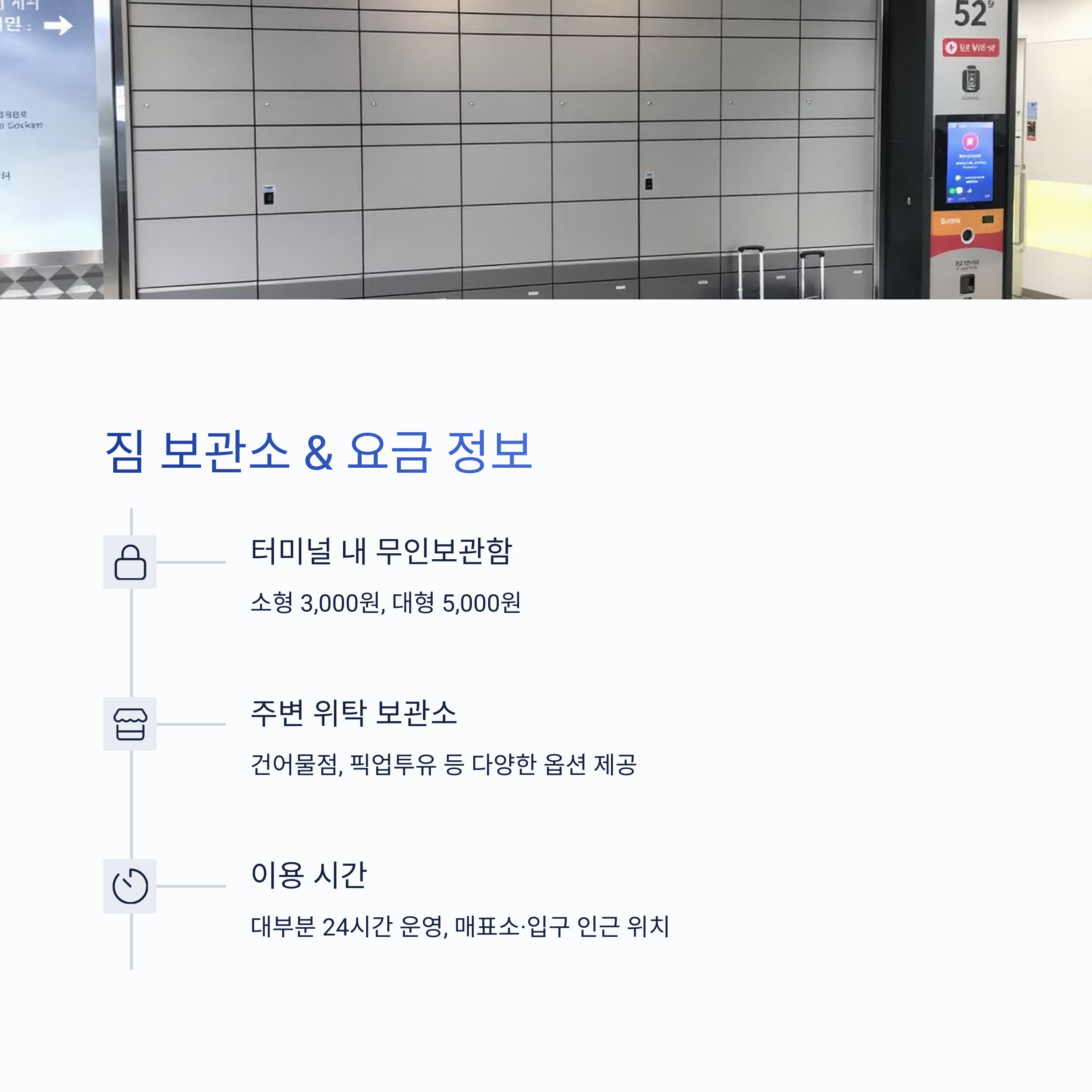 짐 보관을 위한 무인 보관함은 메가커피 옆과 현금인출기 옆 출구에 위치하고 있으며, 소형은 3,000원, 대형은 5,000원으로 4시간 기준 요금이 책정되어 있습니다. 추가 시간당 1,000원이 부과되며, 카드 결제만 가능합니다. 터미널 외에도 맞은편 건어물점, '픽업투유' 앱 예약 서비스를 통해 보관이 가능하고, 일부 숙소에서는 숙소 배송 서비스도 제공합니다. 보관 방법과 위치를 사전에 파악해두면 여행 중 큰 도움이 됩니다.