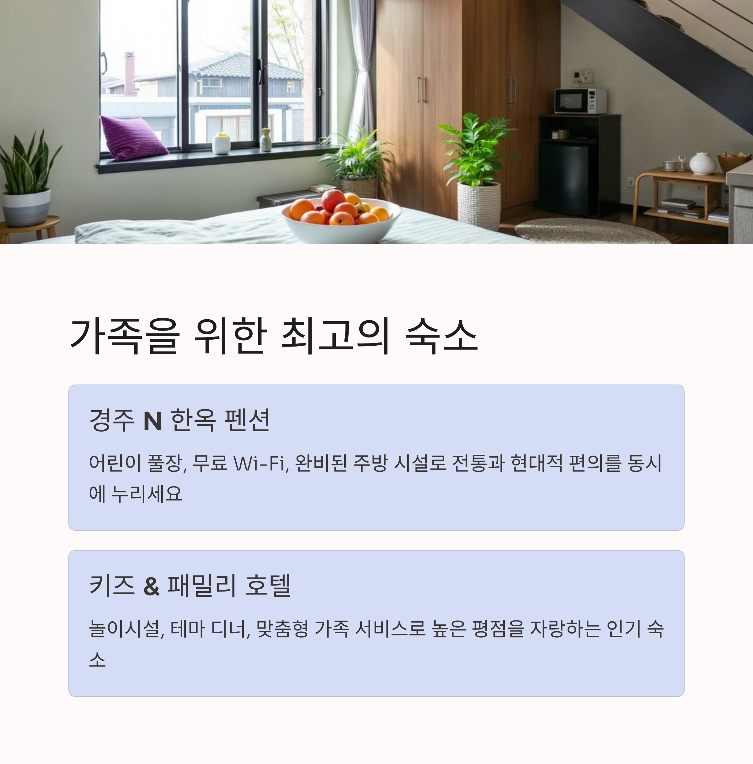 | 어린이 전용 시설과 주방 갖춘 가족 맞춤 숙소 | 대릉원, 보문호수, 첨성대 등 벚꽃 풍경 명소 | 숙소+자연+역사유적까지 가족 여행지 완성 |