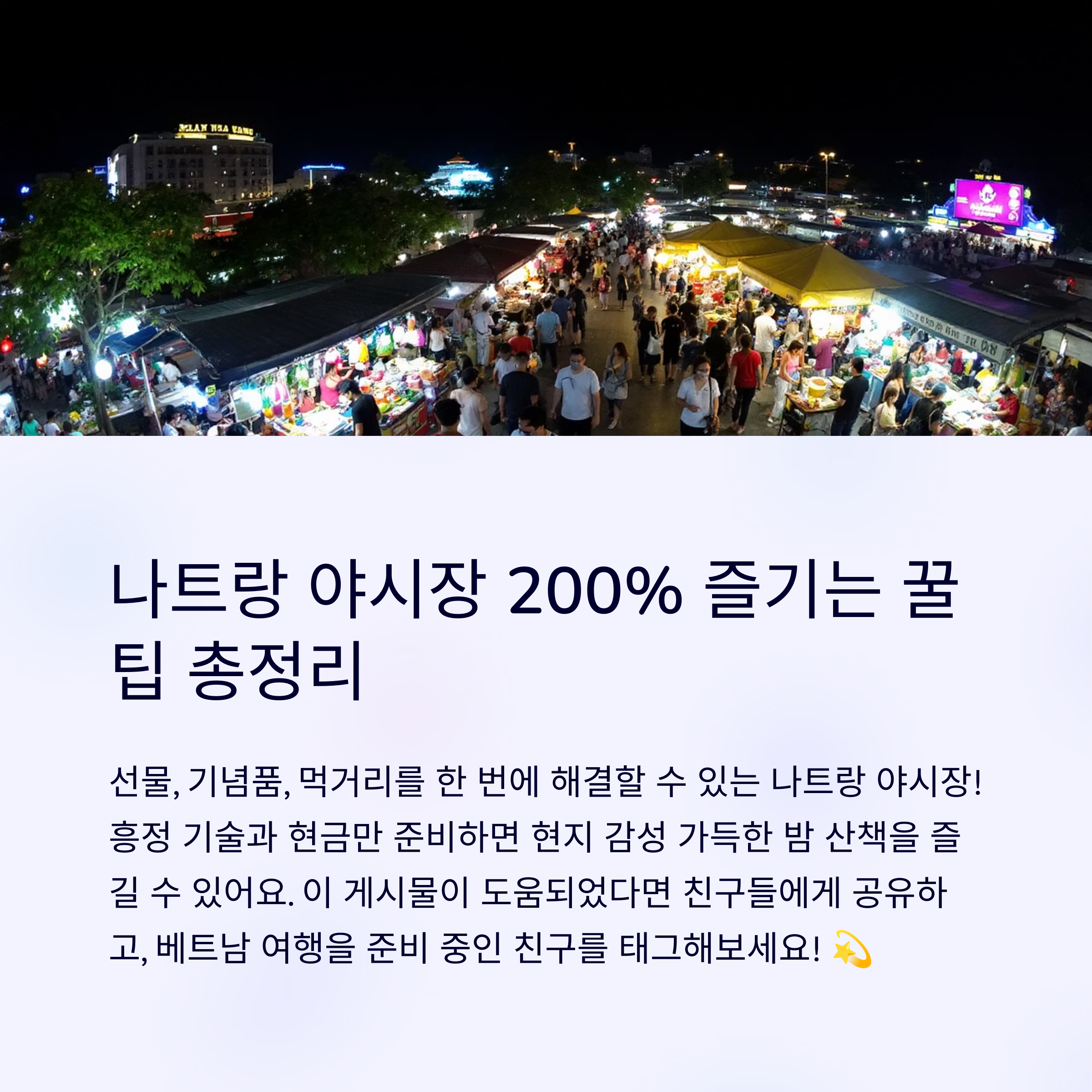 나트랑 여행의 매력을 더해주는 나트랑 야시장은 쇼핑과 체험, 현지 문화가 어우러지는 즐거운 공간입니다. 합리적인 가격대의 기념품과 이국적인 분위기의 먹거리, 그리고 사람들과의 소통까지 다양한 추억을 남길 수 있습니다. 특히 해산貝 제품과 진주 보석류는 나트랑만의 특별함이 담긴 쇼핑 아이템으로 손색이 없습니다. 이번 여행에서는 여유로운 마음으로 야시장을 산책하며 나만의 보석 같은 아이템을 발견해보시길 바랍니다.