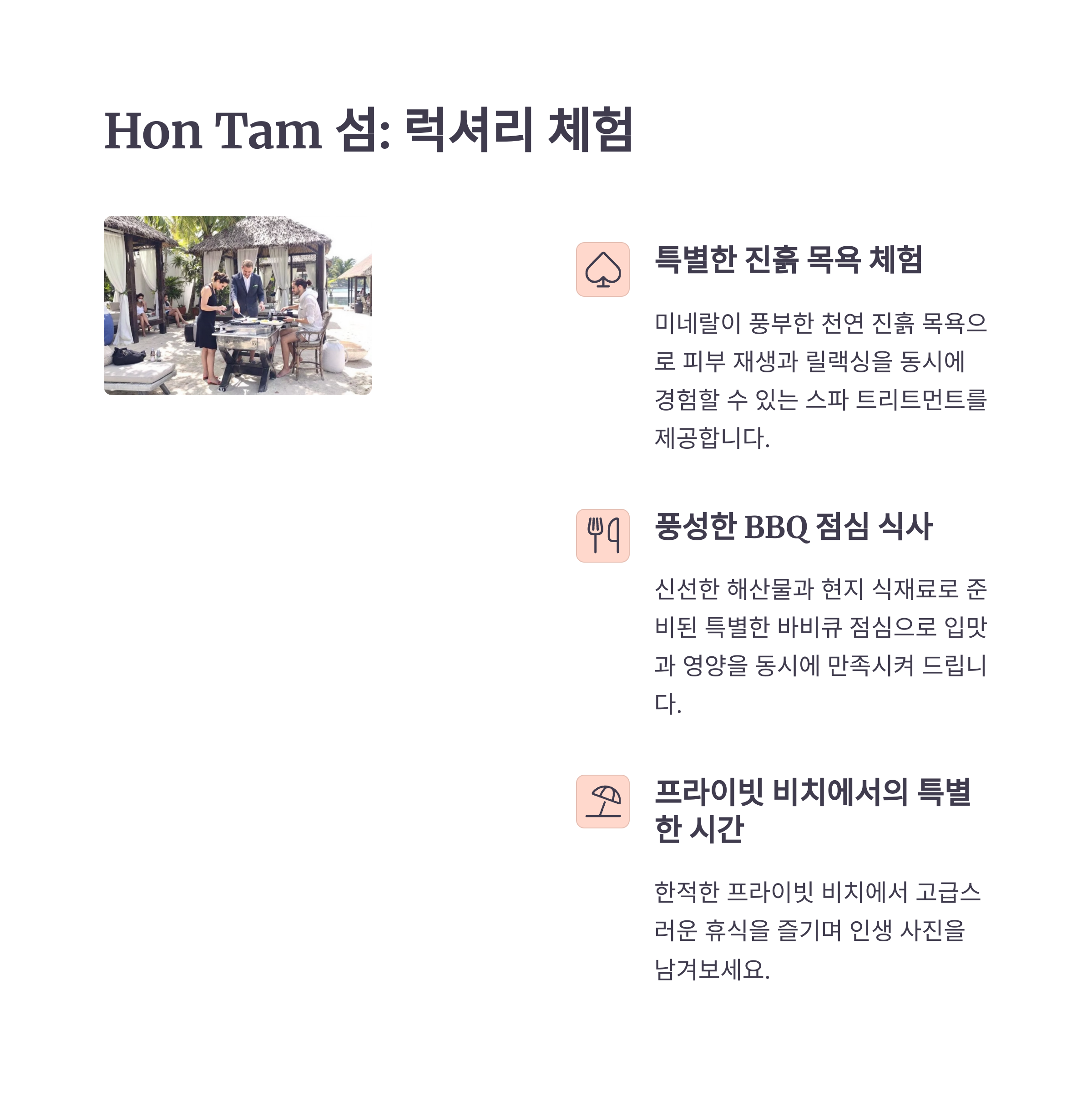 가장 많이 방문하는 섬 중 하나는 Hon Mun입니다. 이곳에서는 투명한 바닷속을 직접 들여다볼 수 있을 만큼 물이 맑고, 다양한 해양 생물과 산호초를 만날 수 있는 스노클링 명소로 손꼽힙니다. 이어 Tranh Beach에서는 조용한 휴식과 해수욕을 즐기기 좋으며, 가족 단위 여행객에게 인기가 많습니다. 럭셔리한 휴식을 원한다면 Hon Tam 섬을 추천드리며, 이곳에서는 진흙 스파, BBQ 점심, 리조트 스타일의 시설이 제공되어 단순한 투어를 넘어선 특별한 하루를 만들어 줍니다.