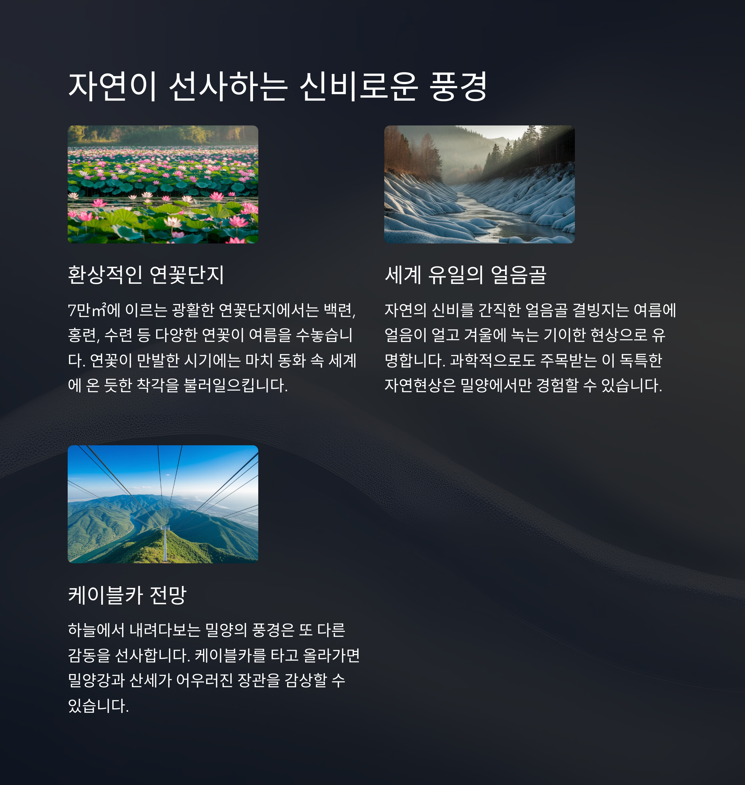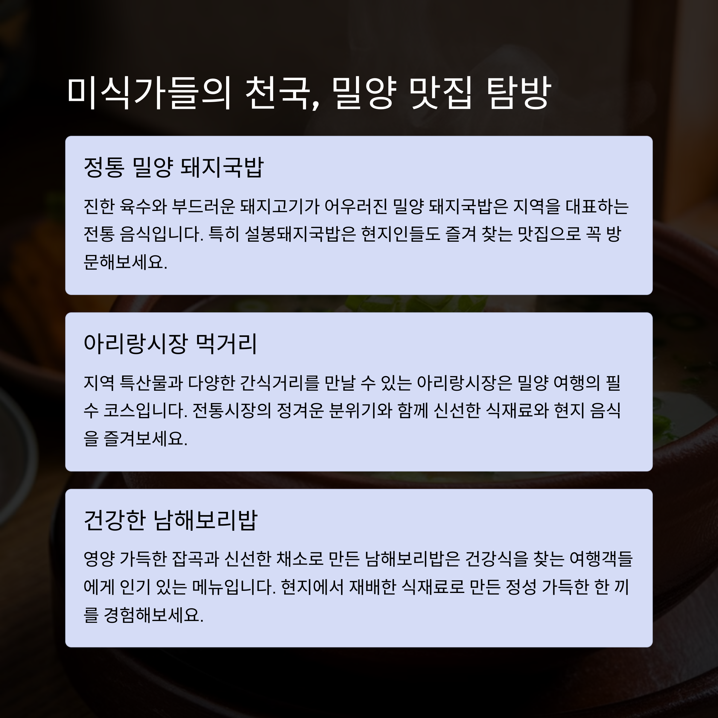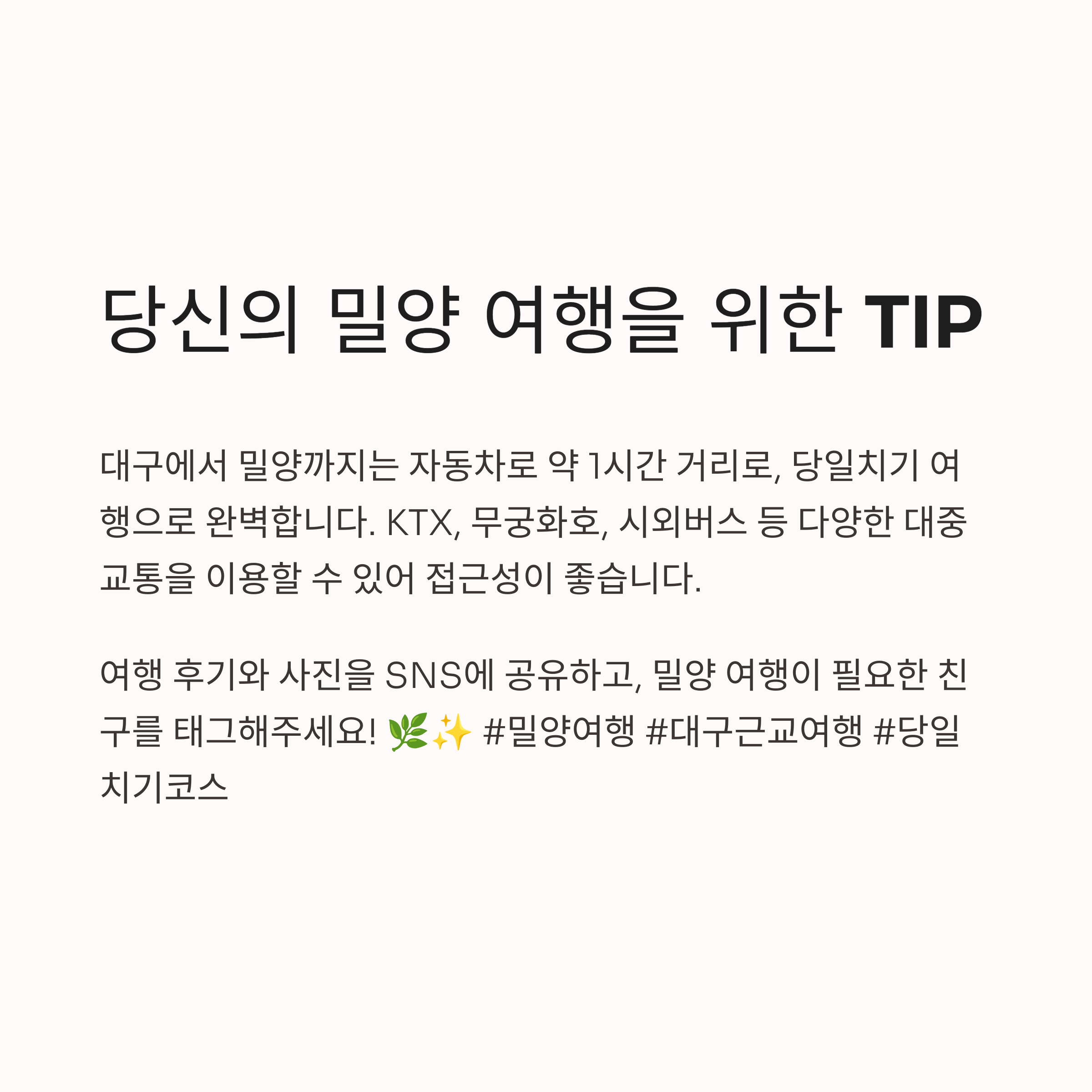 | 밀양 여행 핵심 | 역사와 자연이 조화된 여행지로 당일치기에 적합합니다. |