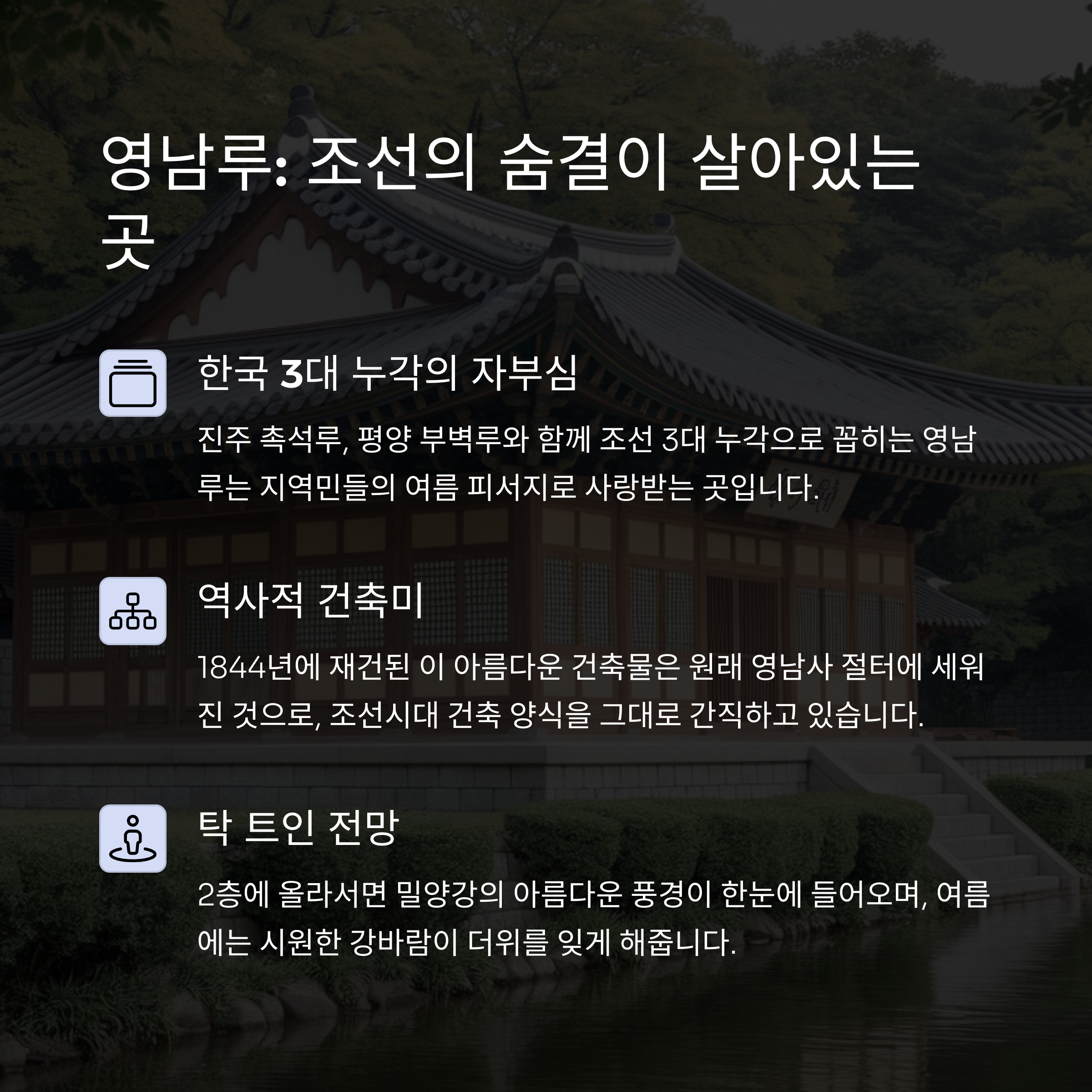 | 조선시대 공익교육 기관, 봄에는 매화 명소 | 밀양 특산물과 보리밥 맛집이 모여 있는 전통시장 | 한국의 3대 누각 중 하나, 밀양강 풍경 명소 |