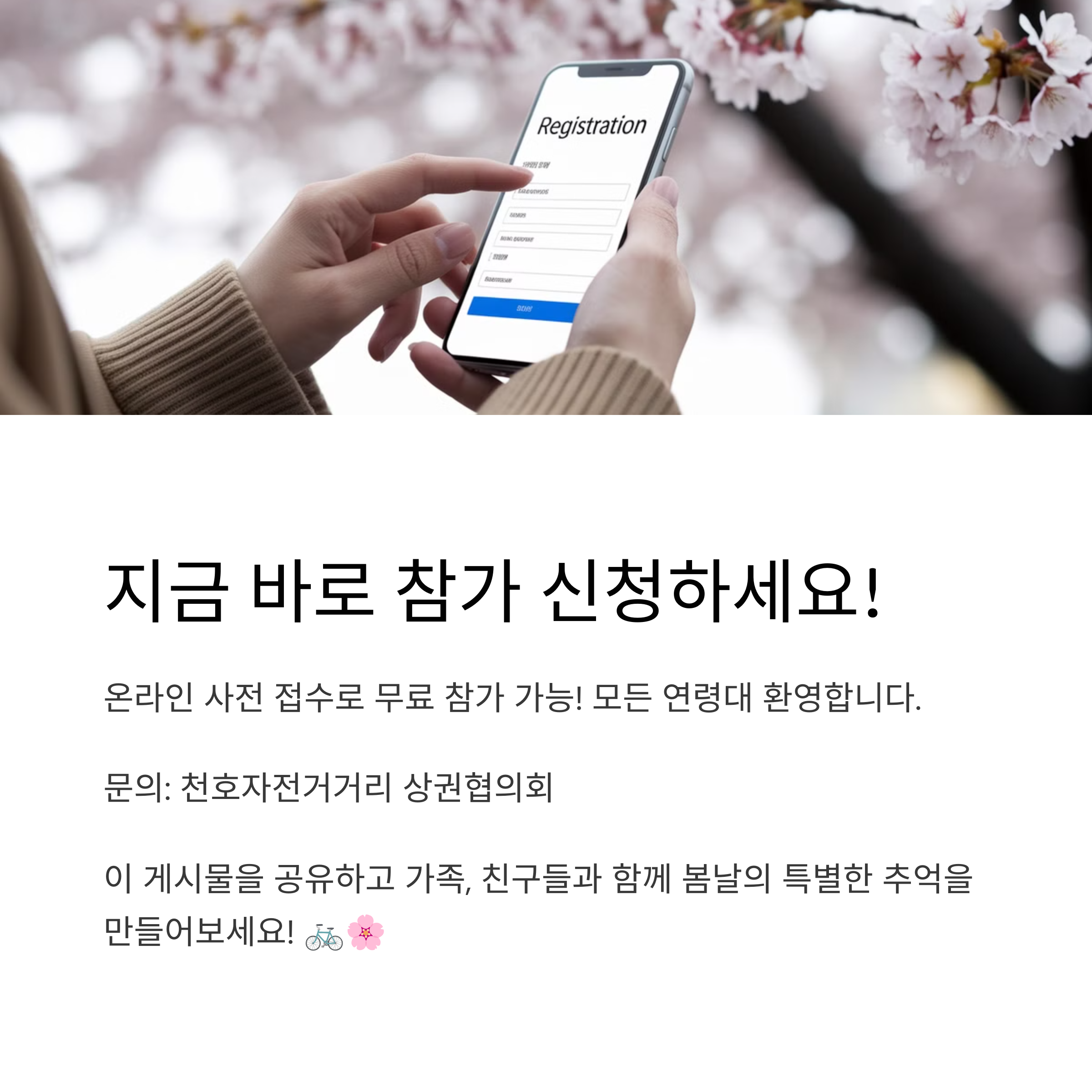 완주한 참가자들에게는 기념 메달과 선물이 제공되며, 행사장 곳곳에는 간이 포토존, 자전거 점검 부스, 간식 제공 코너 등 다양한 편의 시설도 함께 운영됩니다. 특히 지역 상권과 연계된 소상공인 부스도 함께 마련되어 있어 지역 경제 활성화에도 긍정적인 효과를 주고 있습니다. 봄바람을 가르며 가족 또는 친구와 함께 잊지 못할 하루를 보낼 수 있는 기회, 천호자전거거리에서 시작해보세요.