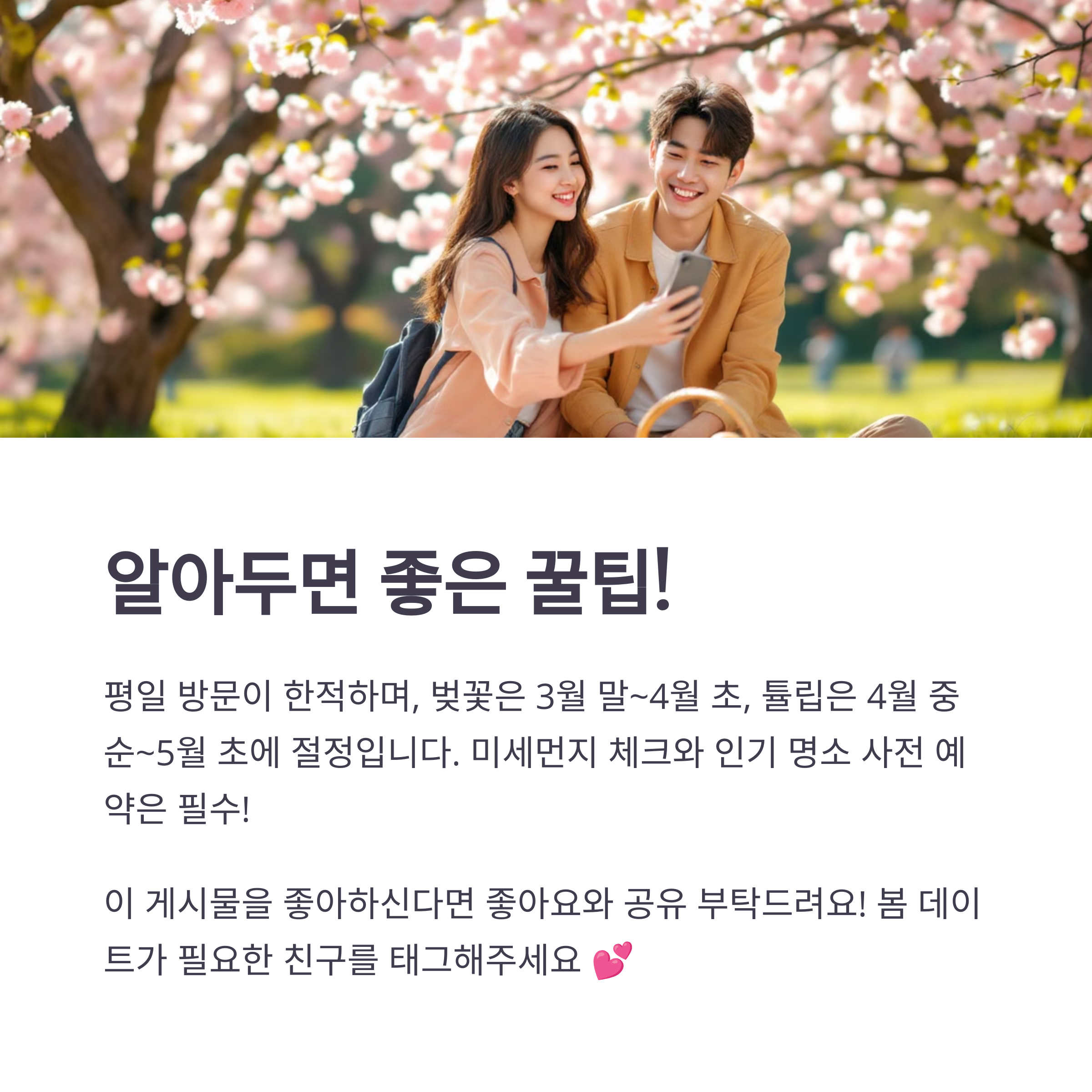 따뜻한 햇살과 함께하는 봄날, 사랑하는 사람과 떠나는 꽃길 산책은 평범한 일상에 특별함을 더해줍니다. 튤립의 화려함, 벚꽃의 낭만, 고즈넉한 역사 공간까지. 하나의 코스로 묶인 봄꽃 여행은 소중한 추억이 될 거예요. 이번 주말, 간단한 준비만으로도 잊지 못할 데이트를 완성해보세요. 여러분의 봄날을 응원합니다!