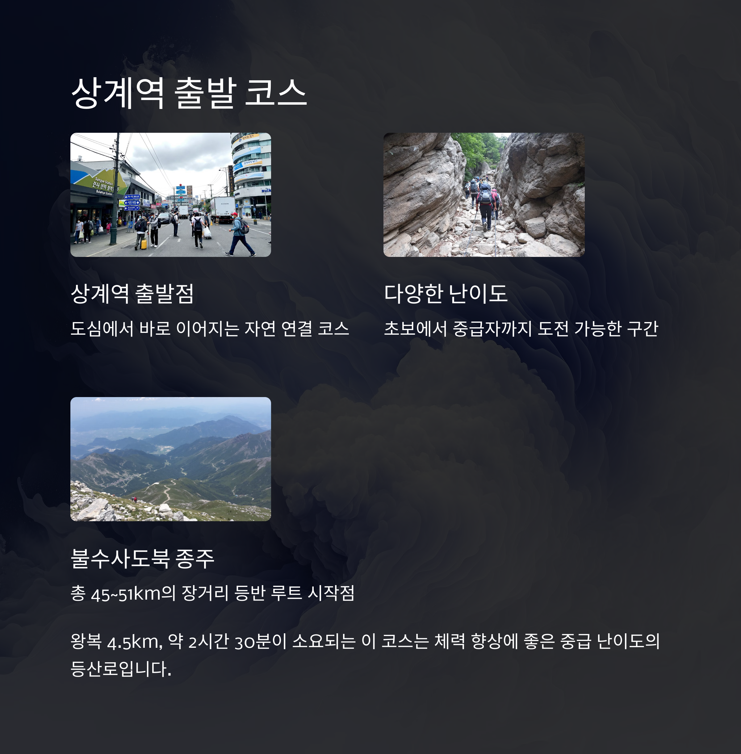 | 불수사도북 종주 시작점 | 서울 강북 5대 산을 잇는 장거리 도전 코스의 출발지 |