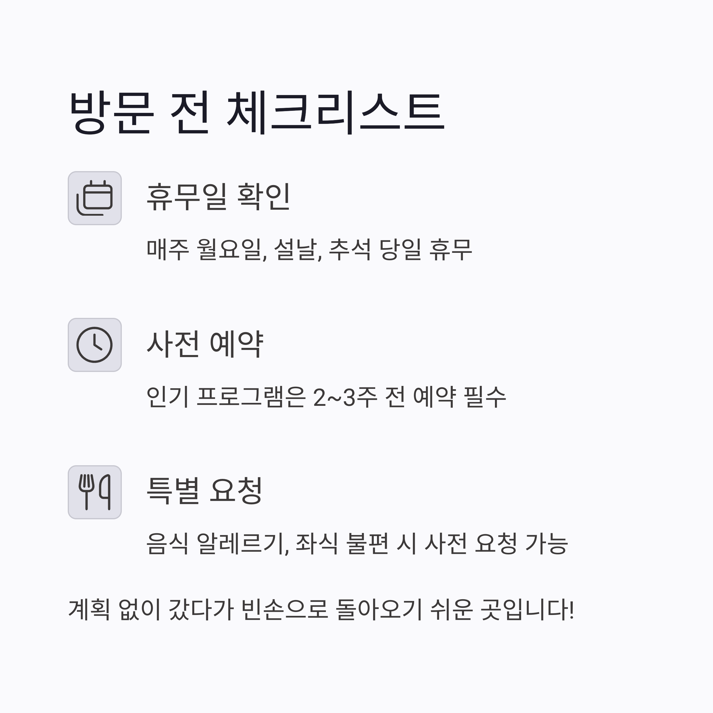 - ✅ 인기 프로그램은 2~3주 전 예약 필수