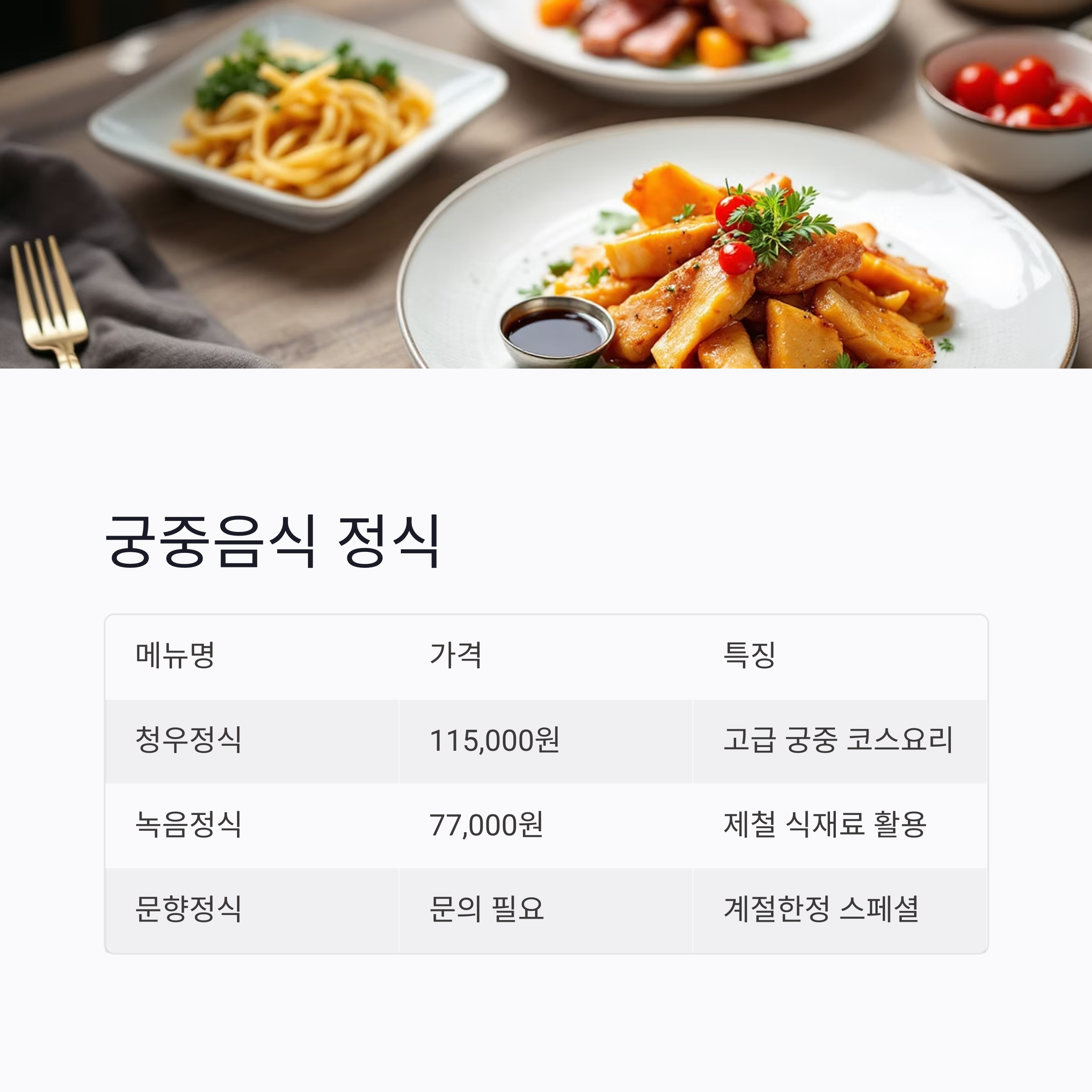 | 청우정식 | 115,000원 | 고급 궁중 코스요리, 정통 궁중식 |
