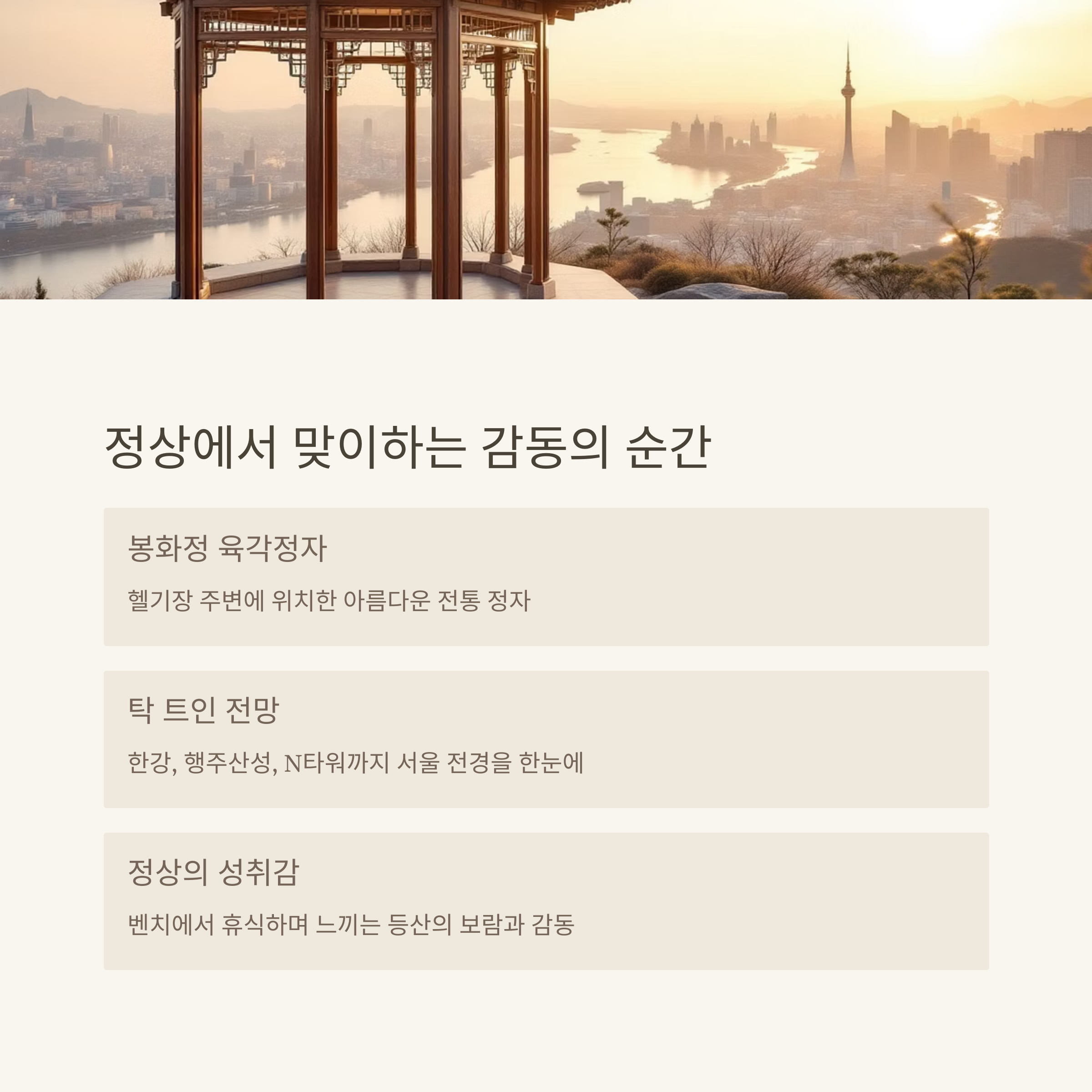 각 장소마다 색다른 풍경과 이야기가 있어 등산의 재미를 더해줍니다