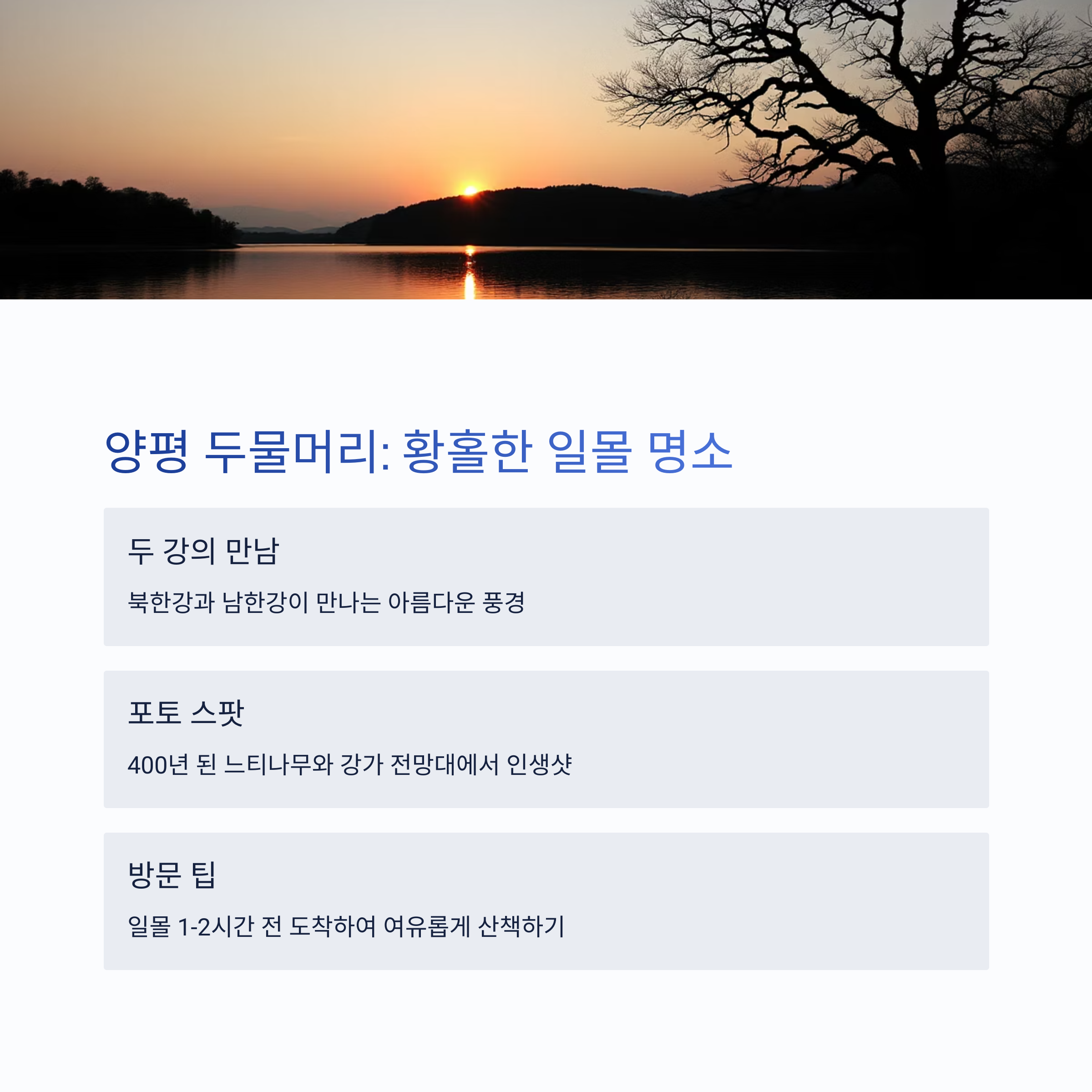 바쁜 일상 속에서 잠시 벗어나 자연을 마주하고 싶은 날, 멀리 떠나지 않더라도 서울 근교에는 하루 만에 다녀올 수 있는 매력적인 여행지가 많이 있습니다. 이번 글에서는 가평, 양평, 곤지암 등 수도권에서 쉽게 접근할 수 있는 장소들 중에서, 특히 풍경이 아름답고 문화 체험도 가능한 곳들을 중심으로 5곳을 엄선하여 소개드립니다. 여행은 꼭 멀리 떠나야만 의미 있는 것은 아닙니다. 가까운 곳에서도 충분히 힐링할 수 있으며, 오히려 짧은 시간 안에 깊은 여운을 남기는 경험이 되기도 합니다. 오늘 소개해 드릴 여행지들은 모두 서울에서 1~2시간 이내로 도착할 수 있고, 자연과 도시의 조화를 느낄 수 있는 특별한 매력을 지니고 있습니다. 계절마다 변화하는 풍경 속에서 하루를 온전히 즐길 수 있는 당일치기 여행지, 지금 바로 떠나보세요.