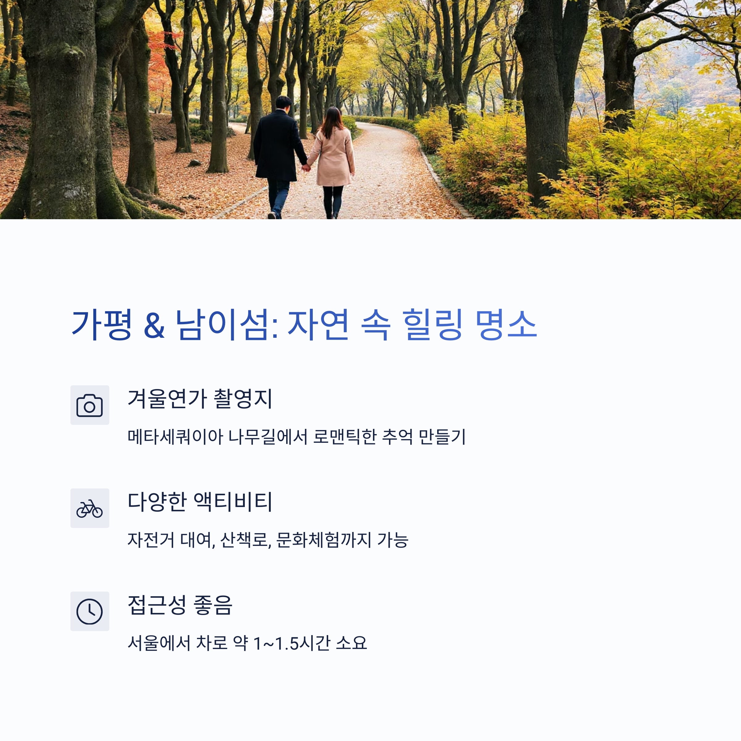 | 접근 시간 | 서울에서 1~2시간 내외의 거리로 부담 없이 다녀올 수 있습니다. |