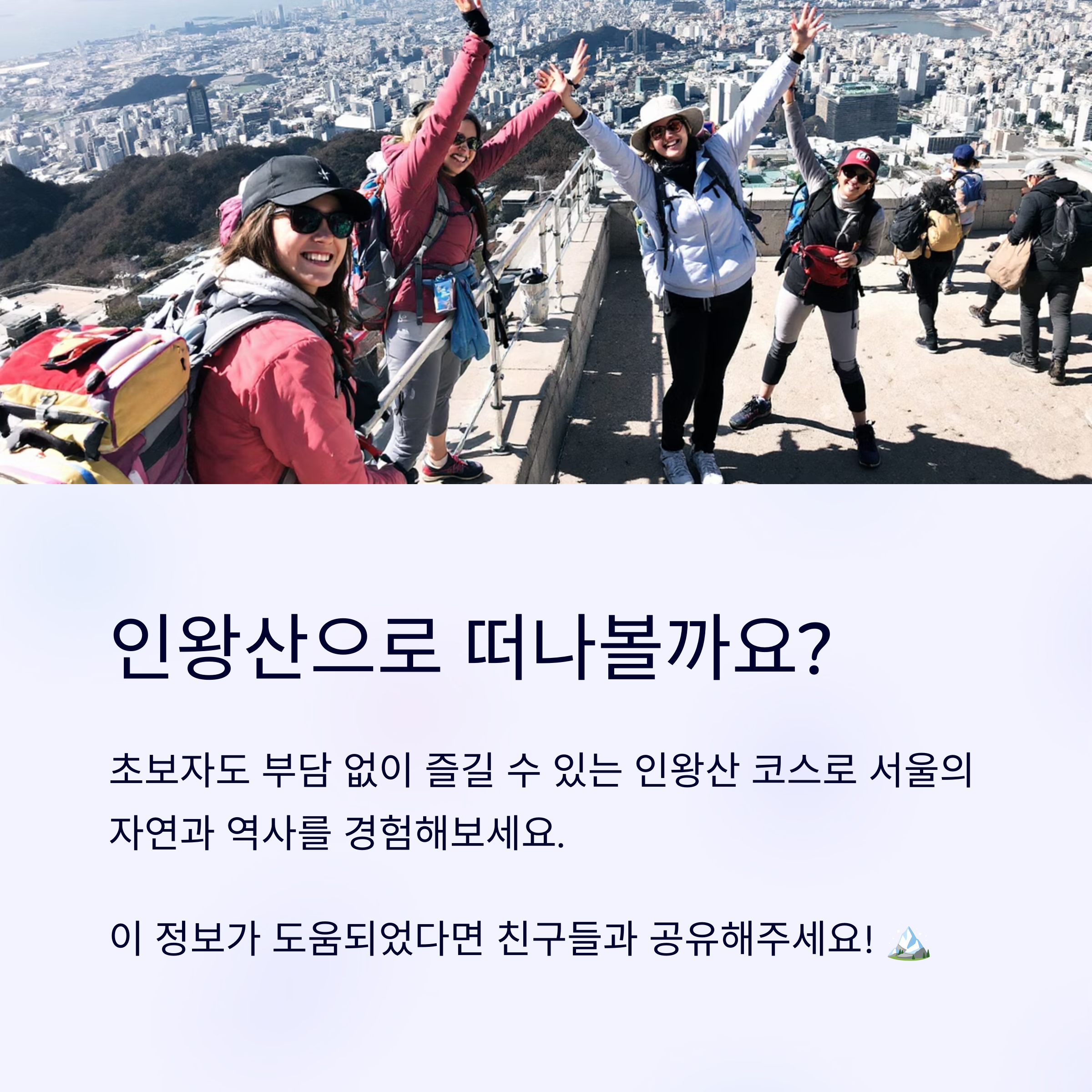 서울 속 자연을 느낄 수 있는 인왕산은 등산 초보자에게도 훌륭한 선택이 될 수 있습니다. 각기 다른 매력을 지닌 두 가지 코스는 걷는 재미뿐 아니라 도심에서의 여유로움까지 선사합니다. 오늘 소개한 경복궁역 출발 코스와 자락길 코스는 난이도가 낮고, 안전하며, 문화적 요소까지 함께 경험할 수 있어 특히 초보자에게 강력 추천드립니다. 날씨 좋은 날, 소중한 사람과 함께 혹은 혼자만의 시간을 가지며 인왕산을 걸어보는 건 어떨까요?