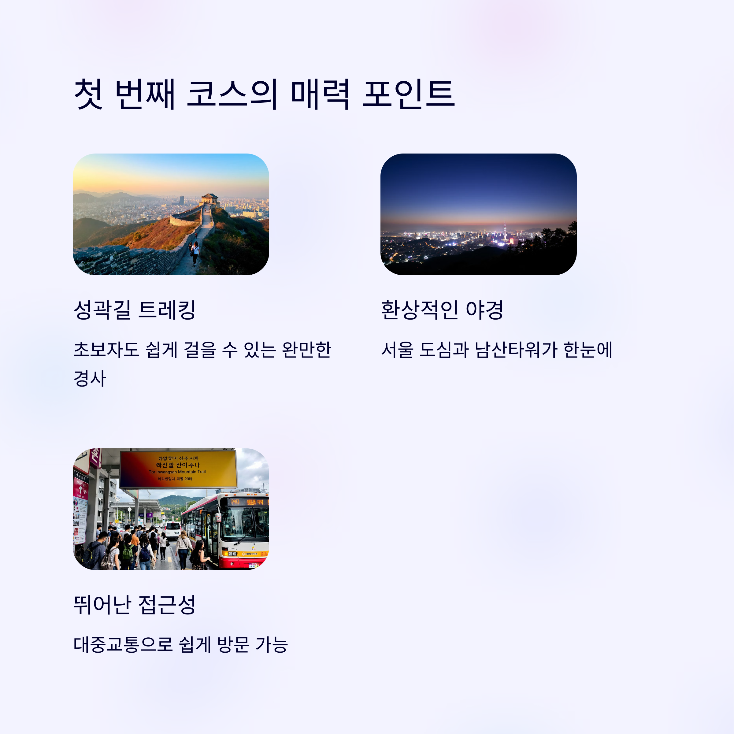 | 인왕산 자락길 코스 | 약 1시간 30분 | 숲길, 문화 유적지, 조용한 분위기 |