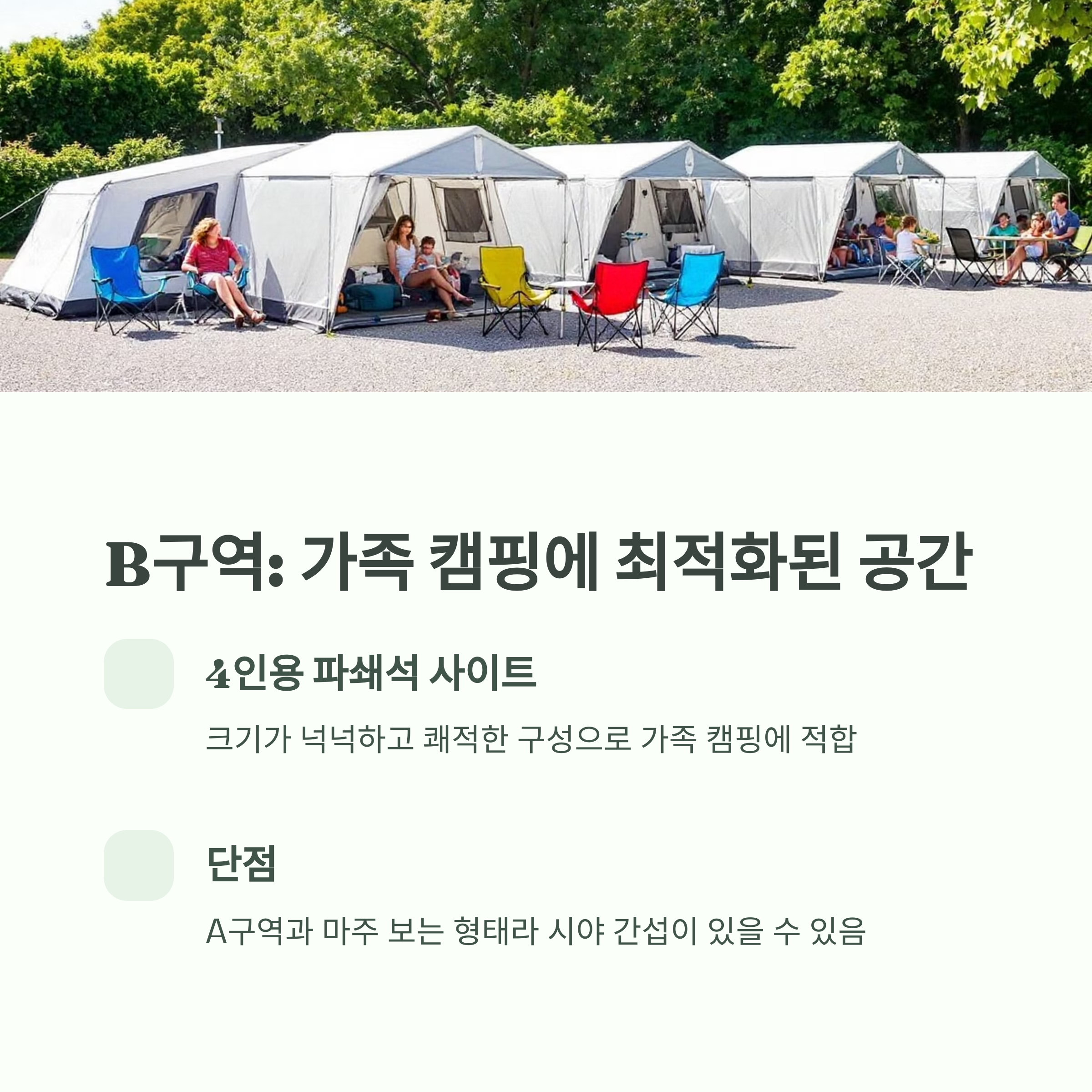 가격은 A구역보다 다소 높지만, 가족 캠퍼들에게는 좋은 선택지입니다.
