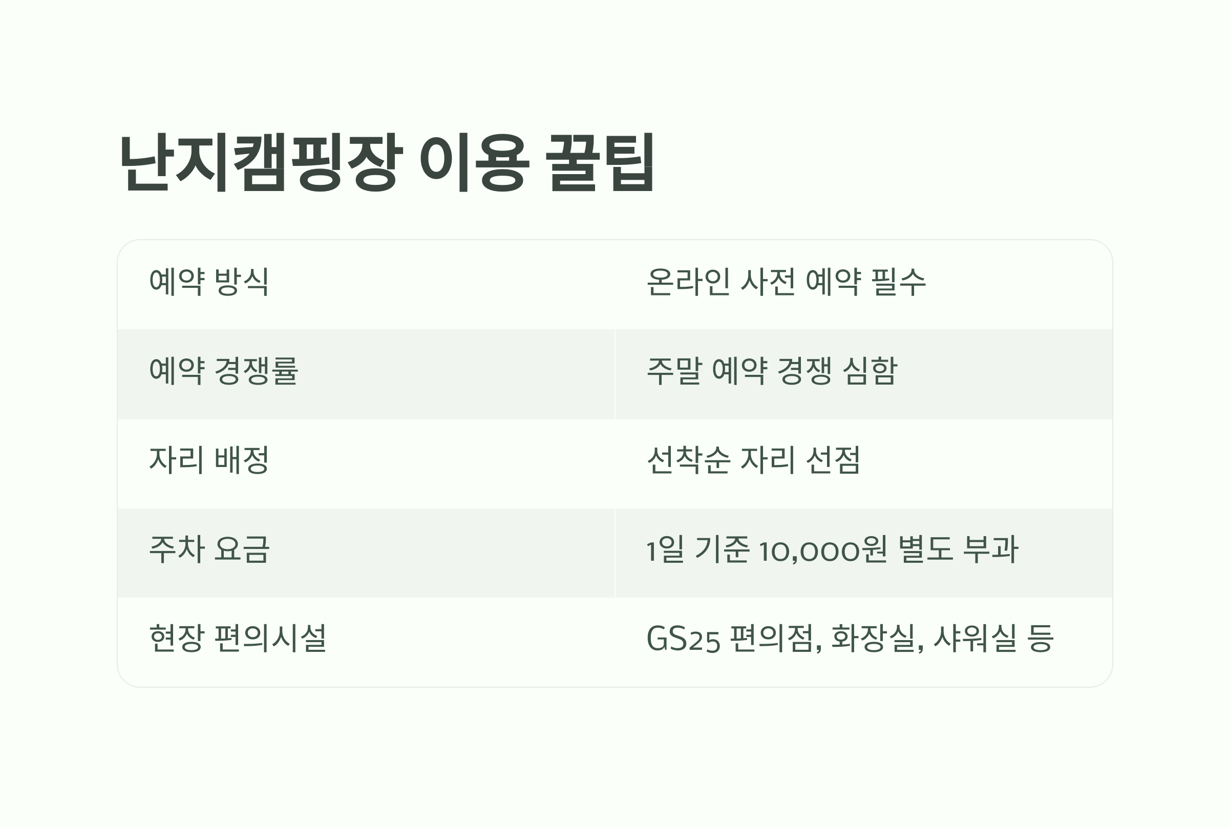 서울 도심에서도 진짜 자연을 느끼고 싶다면, 난지캠핑장은 훌륭한 선택입니다. 구역별 특성과 본인의 캠핑 스타일을 잘 고려하면 처음 캠핑도 성공적인 추억이 될 수 있습니다.
