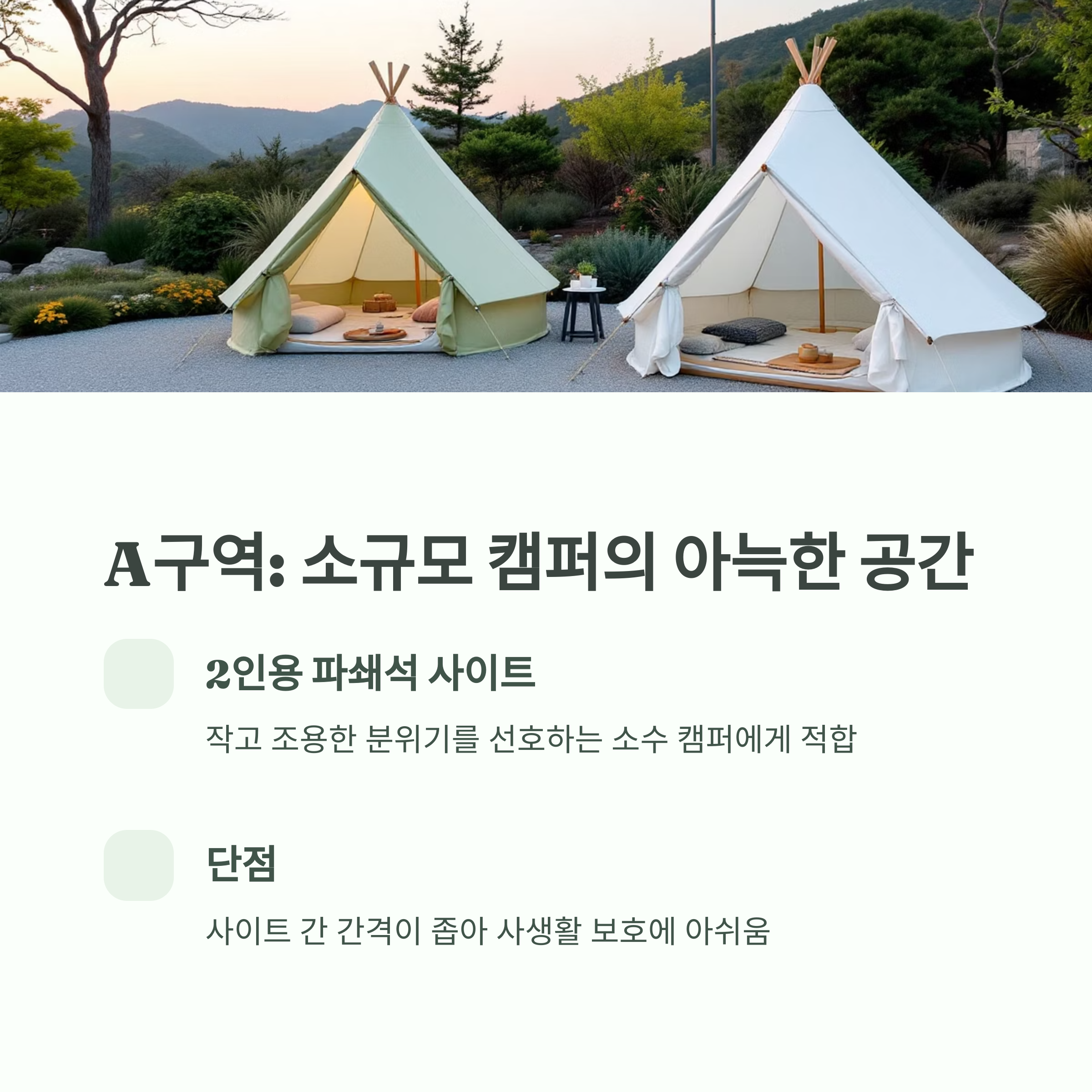 일반캠핑존 A구역 – 소규모 캠퍼를 위한 아늑한 공간