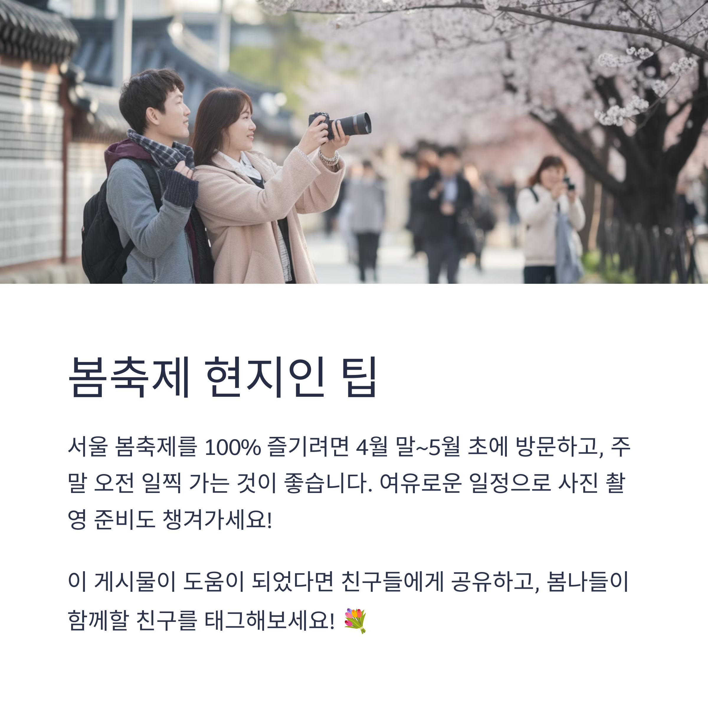 이 글이 도움이 되셨나요? 또는 여러분만 알고 있는 봄 명소가 있다면 댓글로 꼭 알려주세요! 함께 나누는 정보가 더 풍성한 서울 봄 여행을 만듭니다.