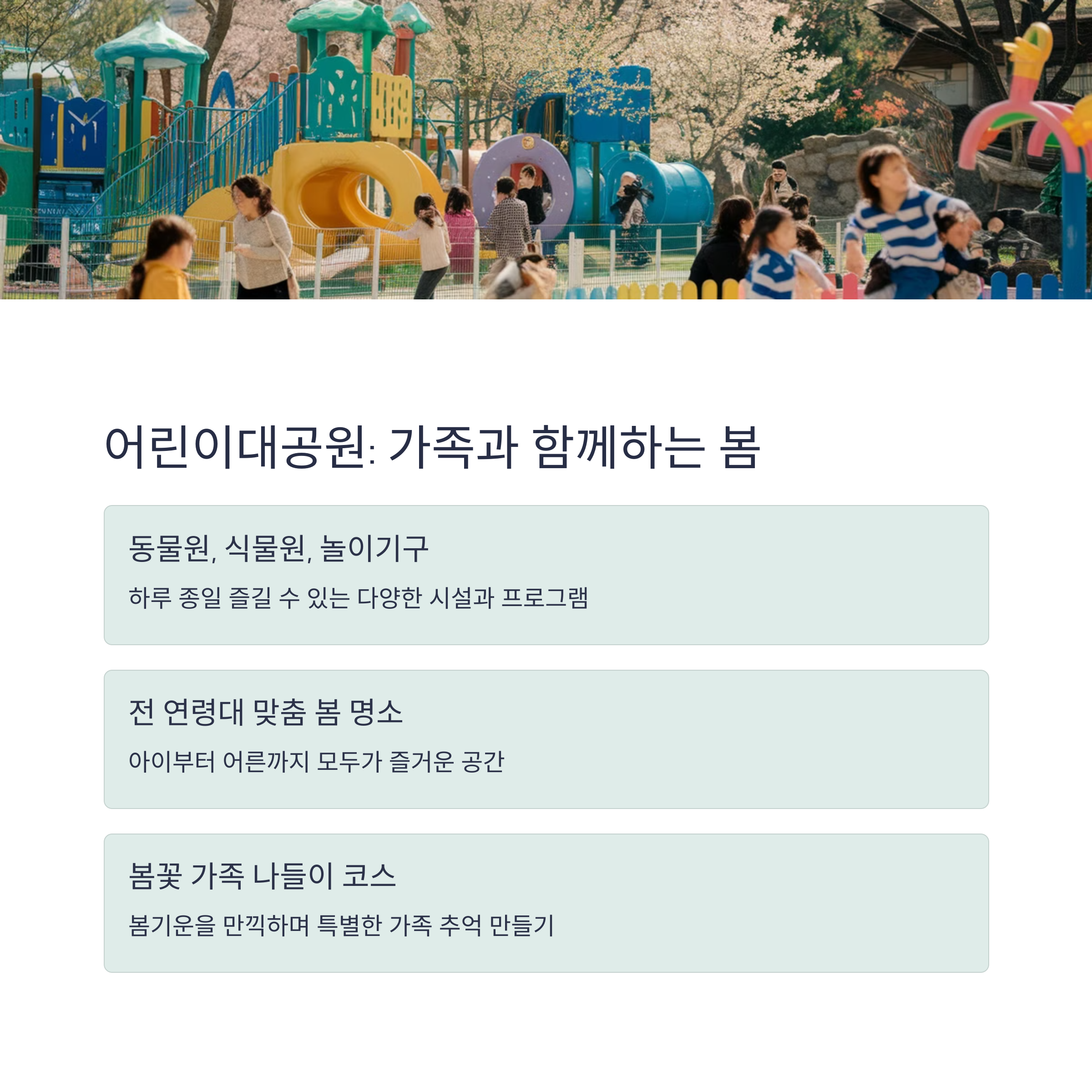 | 벚꽃축제 기간엔 다양한 행사도 진행 | 사진 찍기 좋은 배경과 풍성한 꽃길 | 동물원과 식물원도 함께 즐길 수 있음 |