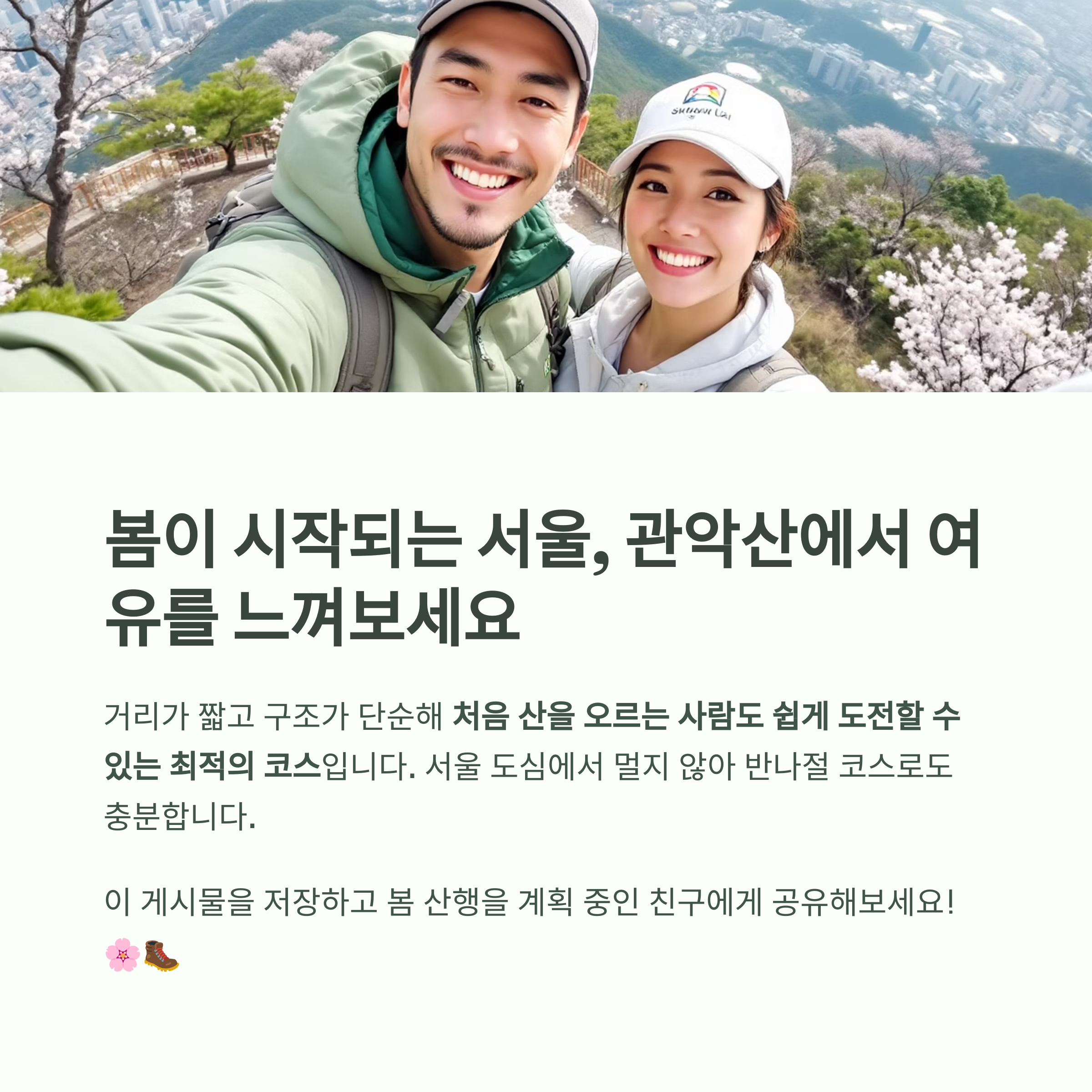 "봄이 시작되는 서울, 관악산 최단코스에서 자연과 함께 걷는 여유를 느껴보세요."