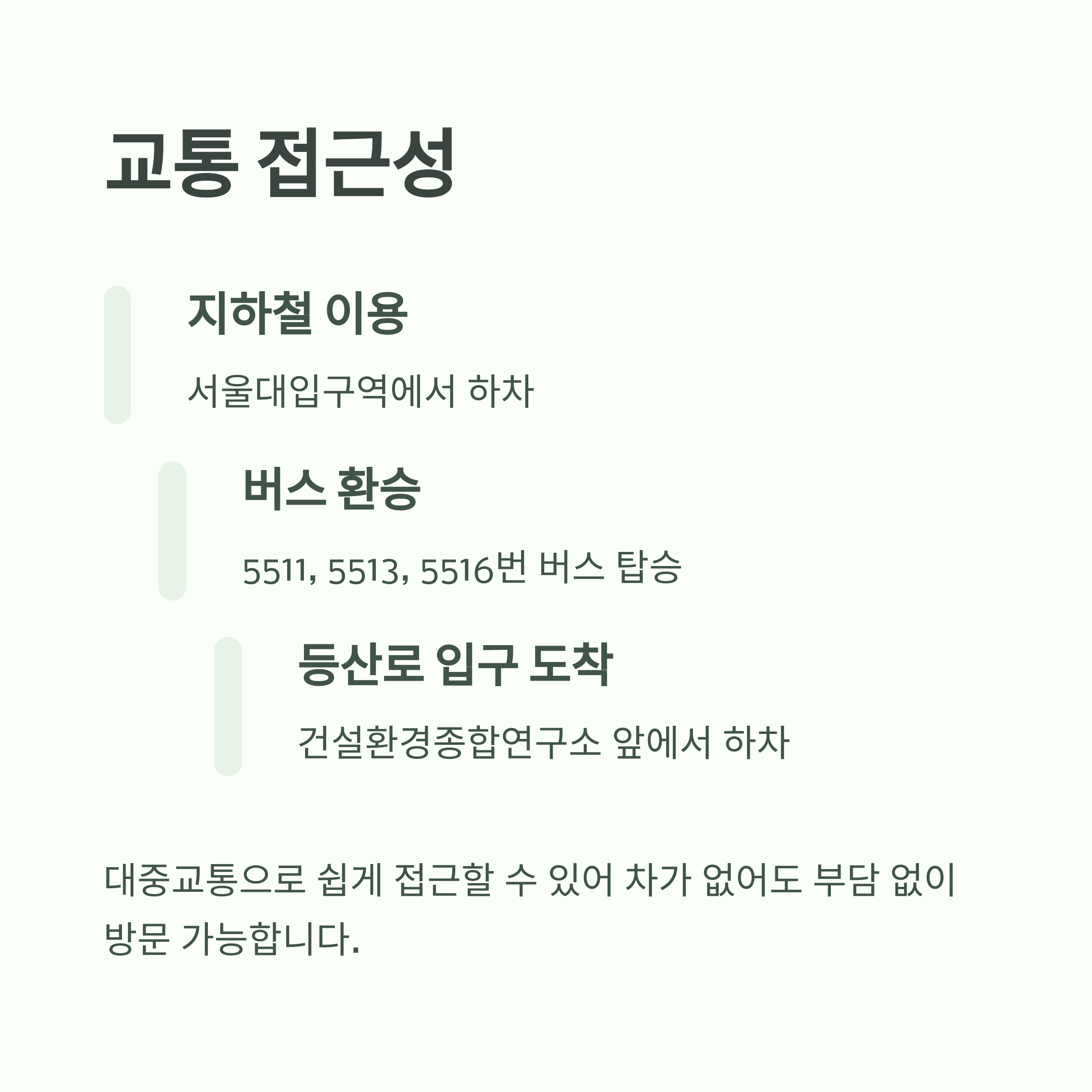 | 대중교통 이용 | 서울대입구역 + 버스 노선 이용 |