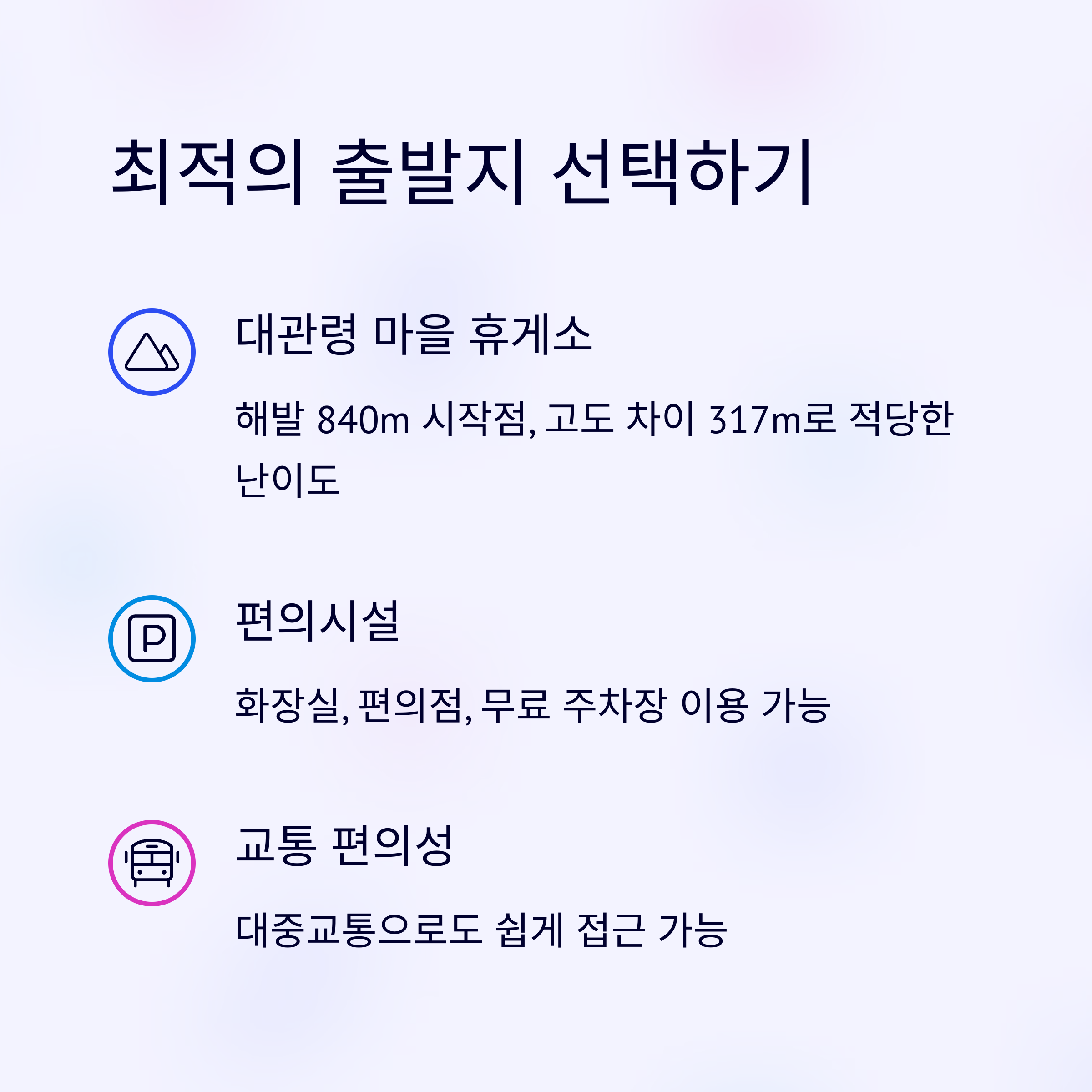 | 최단 코스 출발지 | 대관령 마을 휴게소에서 출발합니다 |