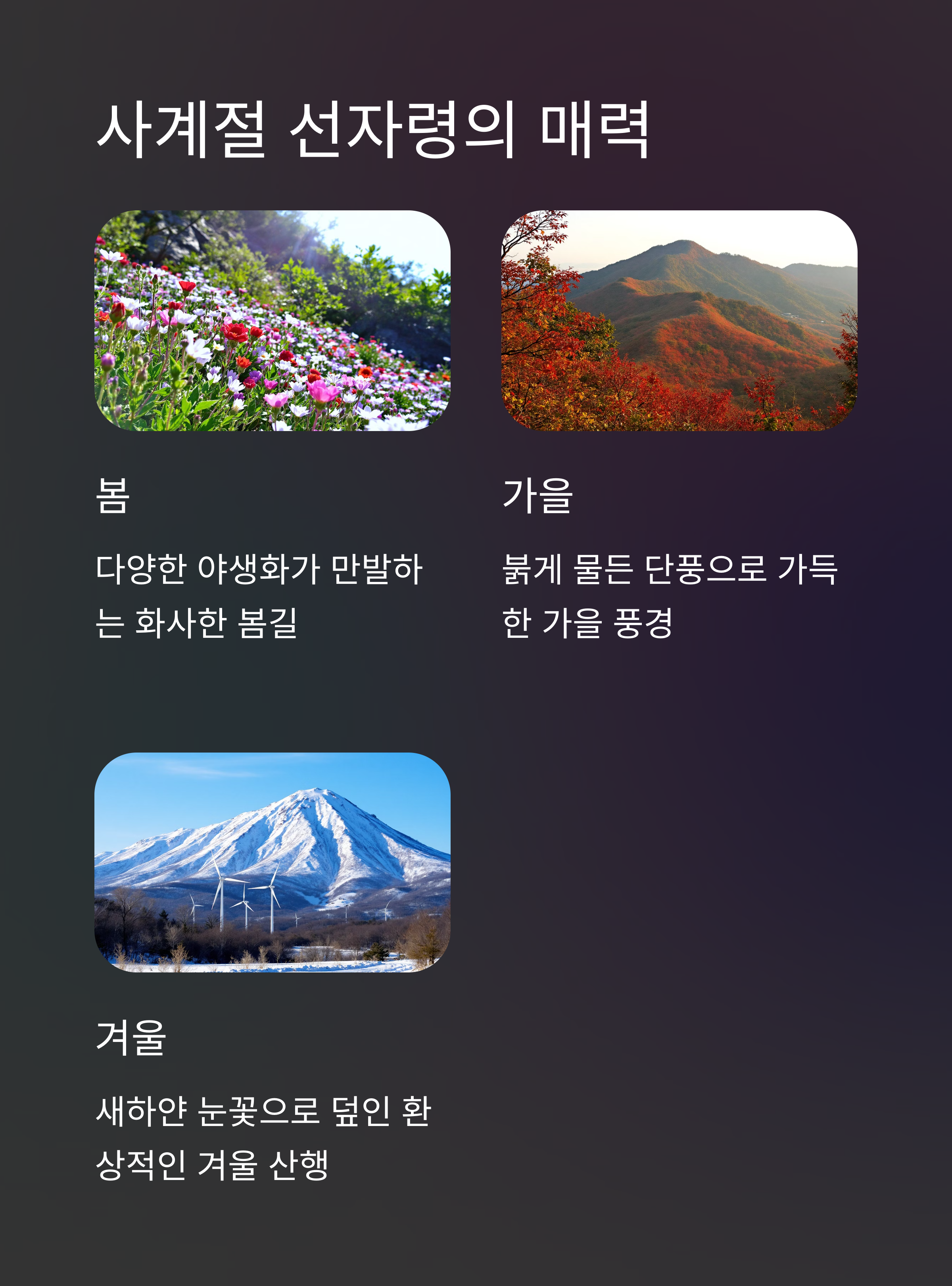 선자령은 사계절 모두 매력적인 경관을 자랑합니다. 봄에는 야생화가 흐드러지게 피어 산 전체가 화사하게 물들고, 여름에는 시원한 계곡 코스를 따라 하산하면서 무더위를 피할 수 있습니다. 가을에는 단풍이 절정을 이루며, 겨울에는 설경이 아름다운 눈꽃 산행지로 사랑받습니다. 계절마다 전혀 다른 모습을 선사하는 선자령은 매번 새로운 즐거움을 주는 힐링 명소입니다.