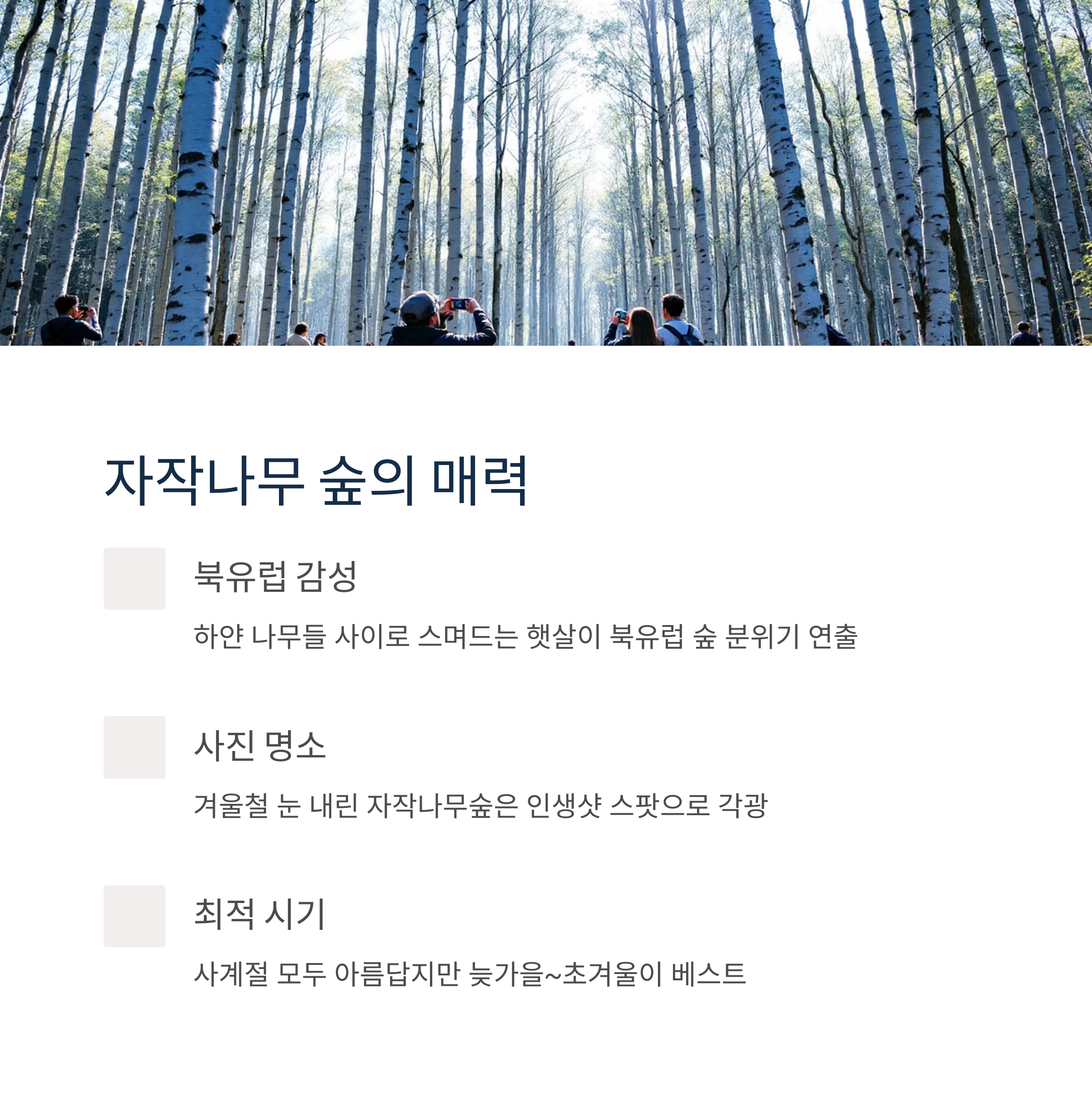 | 특징 | 자작나무숲 + 단풍나무숲 통과 | 침엽수림 중심, 완만한 경사 |