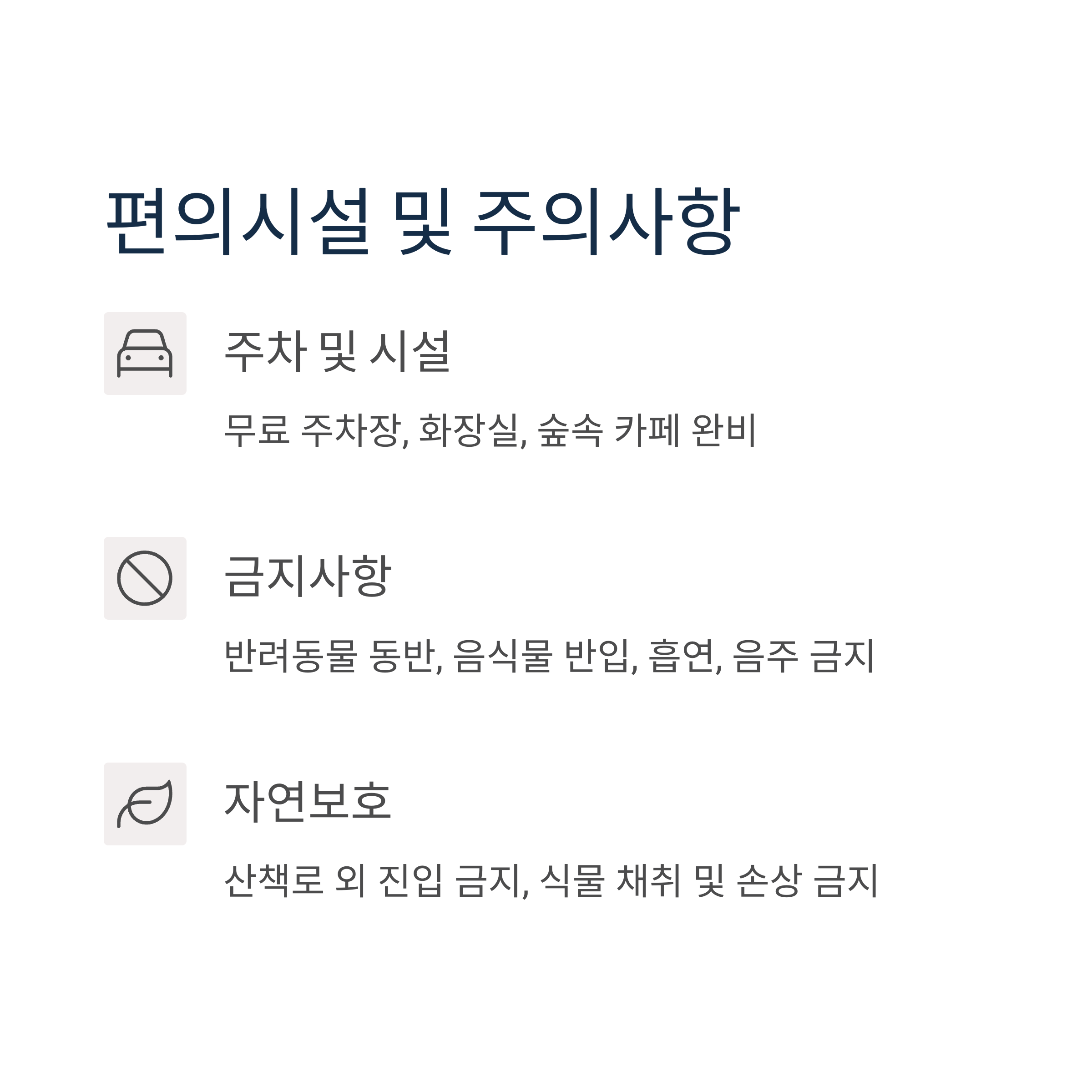 - 오전 10시 이전 방문 시 한적한 분위기에서 산책 가능