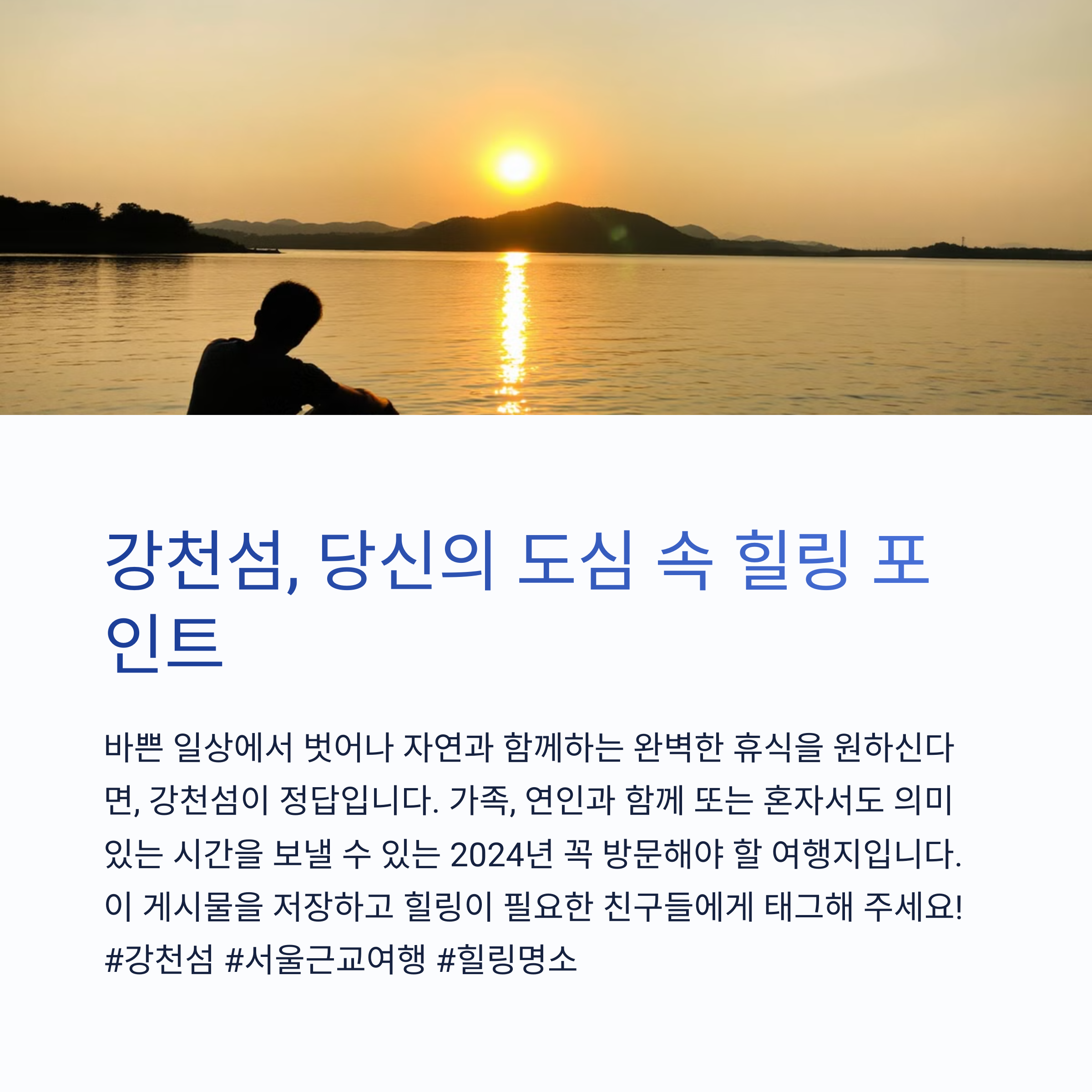 서울 근교에서 당일치기로 자연 속의 여유를 즐기고 싶다면, 여주 강천섬은 꼭 한 번 들러볼 가치가 있는 곳입니다. 넓은 공간과 아름다운 자연, 다양한 체험 프로그램이 어우러진 이곳은 도시에서 벗어나 몸과 마음의 쉼표를 찍을 수 있는 최적의 장소입니다. 혼자서도, 연인과도, 가족과도 모두가 만족할 수 있는 여행지로 사계절 다른 매력을 갖고 있어 언제든지 방문해도 후회 없을 것입니다. 오늘 포스팅을 통해 강천섬에 대한 궁금증이 해소되셨길 바랍니다. 조용한 힐링이 필요하다면, 강천섬으로 떠나보세요.