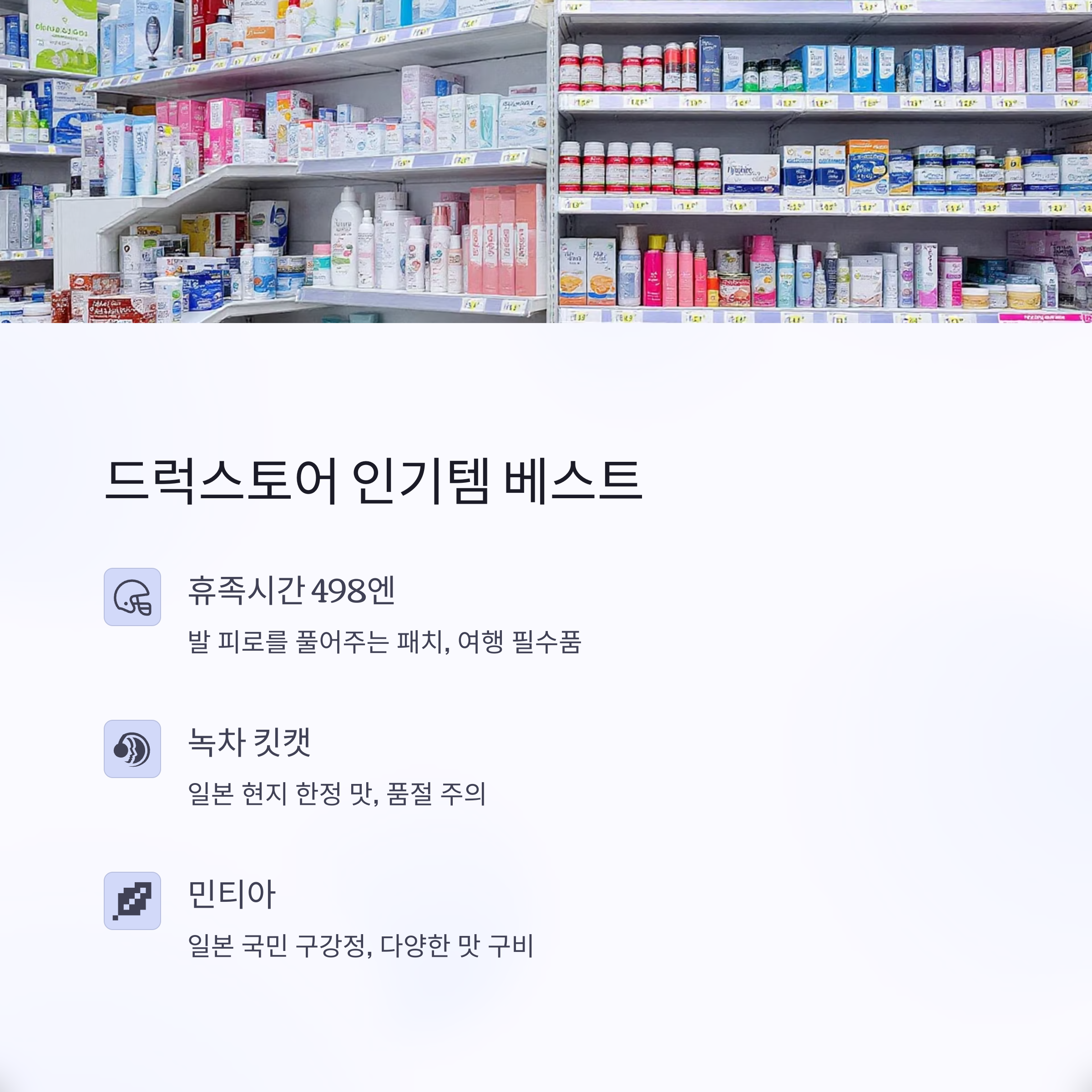 드럭스토어에서 빼놓을 수 없는 추천템도 다양합니다. 휴족시간, 퍼펙트 휩, 마유크림, 로이히 파스 등은 가격 대비 효과가 뛰어나고 선물용으로도 부담 없습니다. 특히 발 피로 회복 패치나 민티아 캔디는 여행 중 피로를 덜어주는 실용템으로 추천합니다. 대부분 일본 현지 가격이 한국보다 저렴하고, 제품 종류도 다양하므로 꼼꼼히 비교해보세요.