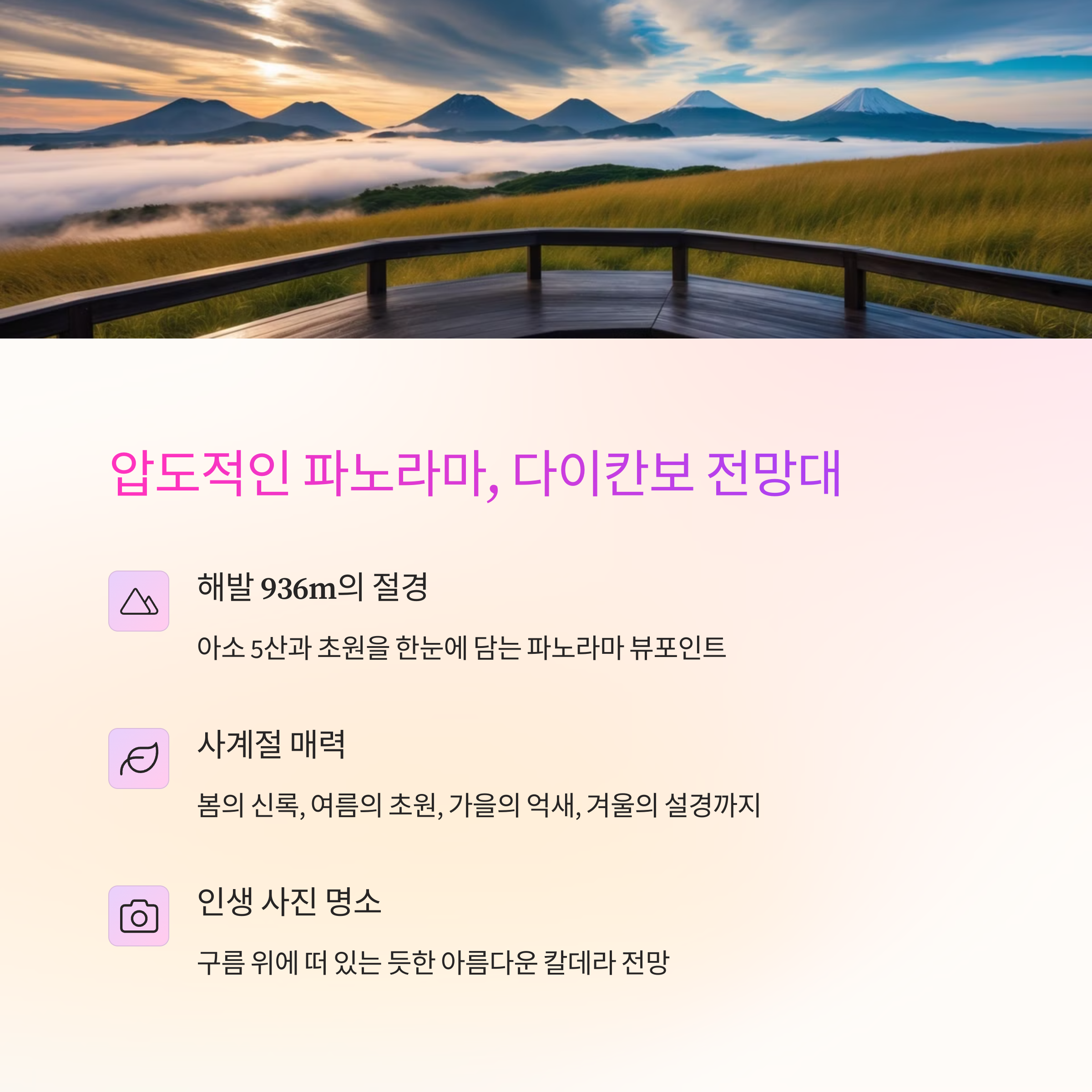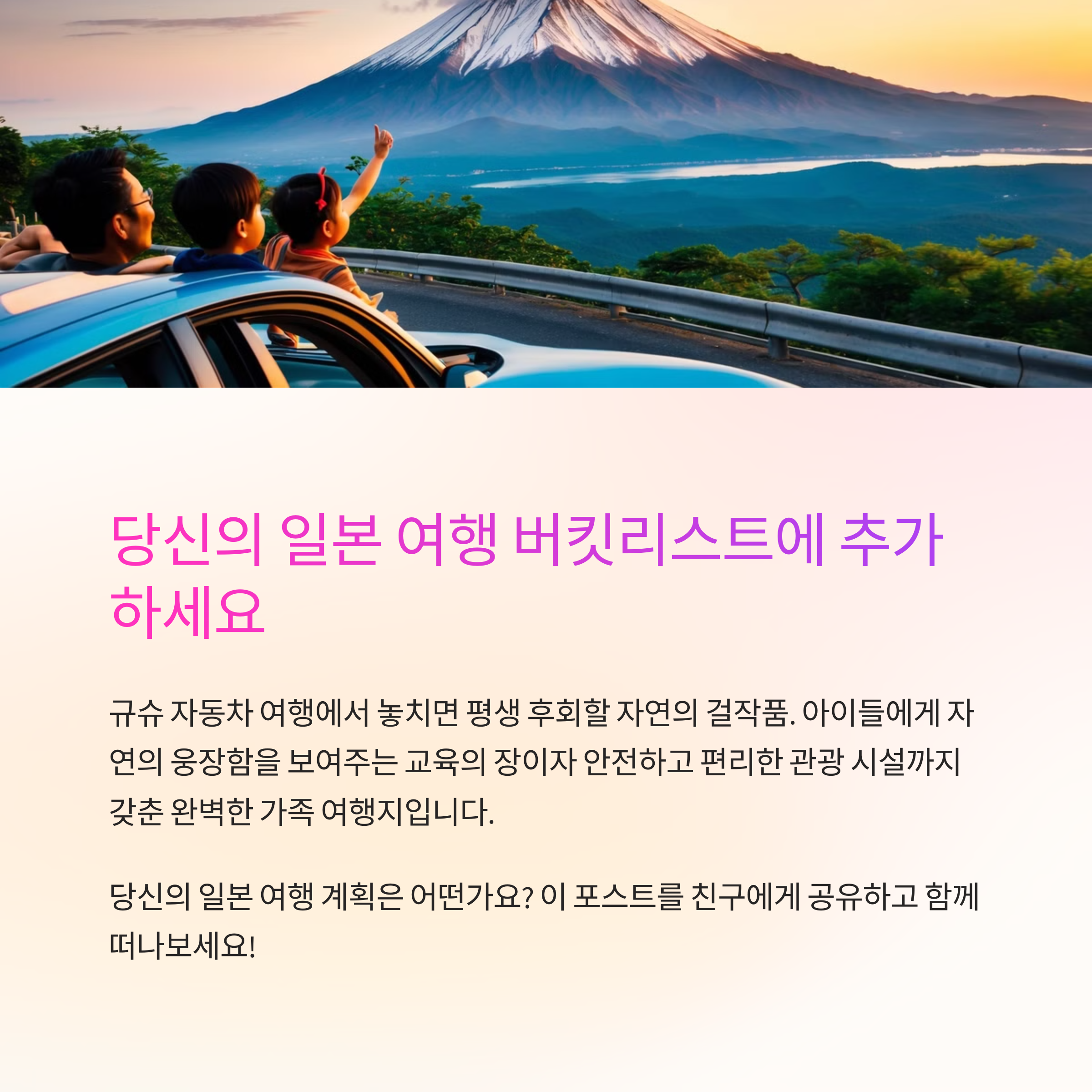 여행이란 결국 ‘느낌’이잖아요. 다이칸보 전망대의 거대한 자연 앞에 서 있던 그 순간, 아소산 분화구에서 피어오르는 연기를 바라보며 숨을 고르던 그 시간… 아직도 생생해요. 만약 여러분도 자동차로 규슈를 달릴 계획이라면, 이 두 곳은 꼭, 진심으로 추천드릴게요. 풍경 하나하나가 마음을 채워주는 기분, 직접 느껴보세요. 그리고 다녀오셨다면 댓글로 여러분의 경험도 공유해 주세요. 진짜 여행은 공유하면서 더 깊어지는 거니까요!