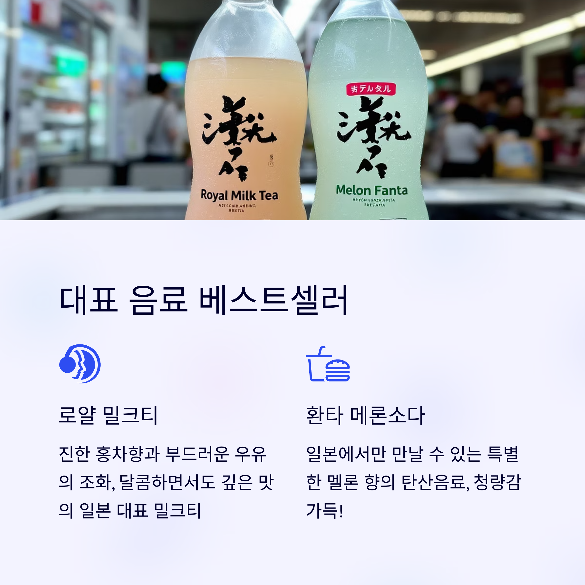 음료 카테고리 또한 일본 편의점에서 빠질 수 없습니다. 대표적으로 로얄 밀크티는 진한 홍차와 부드러운 우유가 조화를 이루며 일본 현지인뿐 아니라 외국인들에게도 인기가 높습니다. 환타 메론소다는 일본에서만 맛볼 수 있는 상큼한 메론향으로, 이색적인 맛을 선호하는 사람들에게 강력 추천됩니다. 요구리나는 요구르트 맛의 물이라는 독특한 콘셉트로 처음 마실 땐 어색하지만 마실수록 중독성이 있다는 평가를 받습니다. 특히 음료는 일본 편의점 전체 매출의 27.3%를 차지할 만큼 구매 비중이 높은 인기 카테고리입니다.