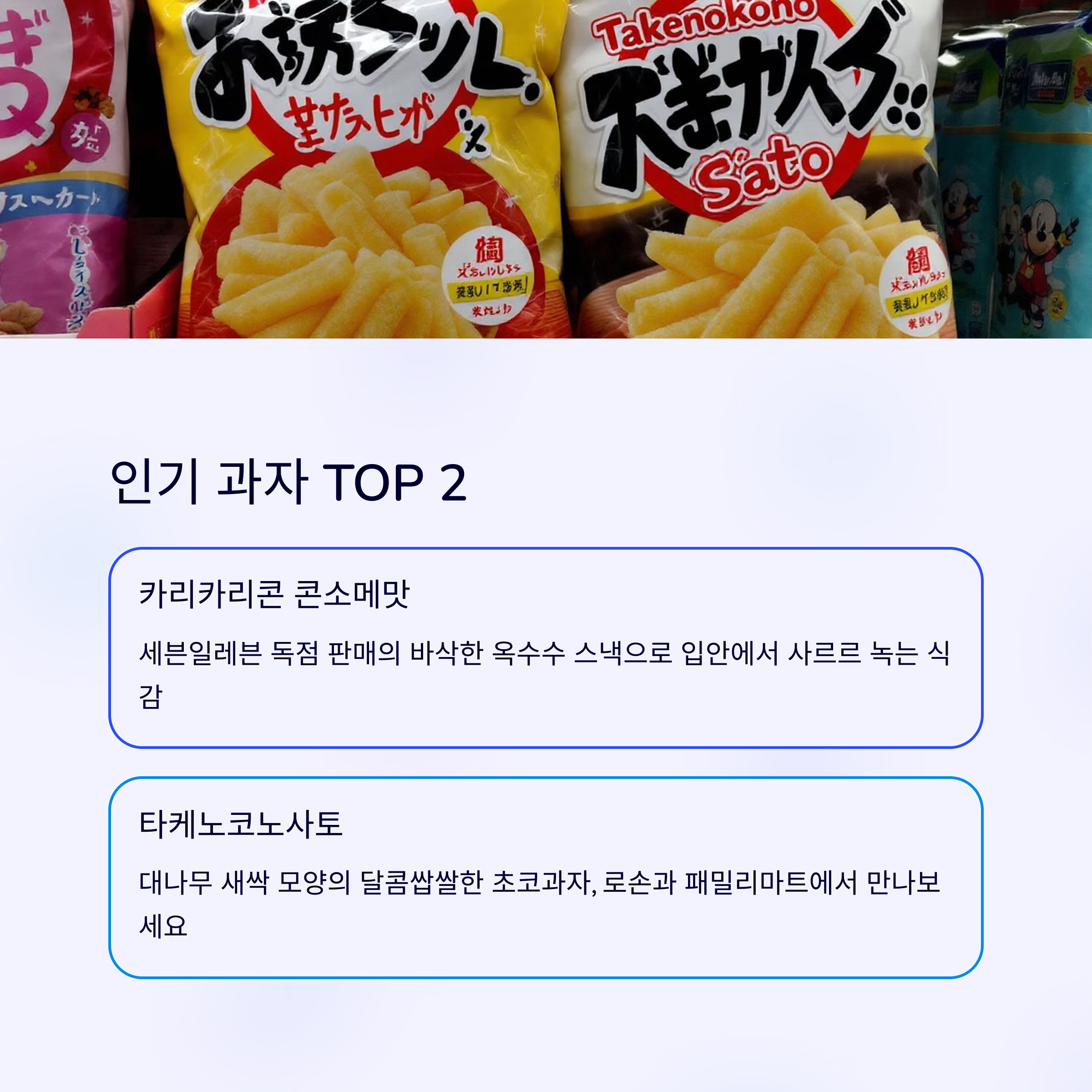 일본 편의점의 대표적인 인기 품목은 단연 과자류입니다. 특히 세븐일레븐의 카리카리콘 콘소메맛은 바삭한 식감과 짭조름한 콘소메 풍미로 꾸준한 사랑을 받고 있으며, 자가리코는 치즈맛과 샐러드맛 등 다양한 맛으로 한 번 먹기 시작하면 멈출 수 없는 매력을 자랑합니다. 타케노코노사토 같은 초코 쿠키도 꾸준한 스테디셀러입니다. 또한 디저트로 인기 많은 노코 가토 쇼콜라는 진하고 촉촉한 초콜릿의 풍미를 자랑하며, 가볍게 즐기기 좋은 간식으로 추천됩니다.