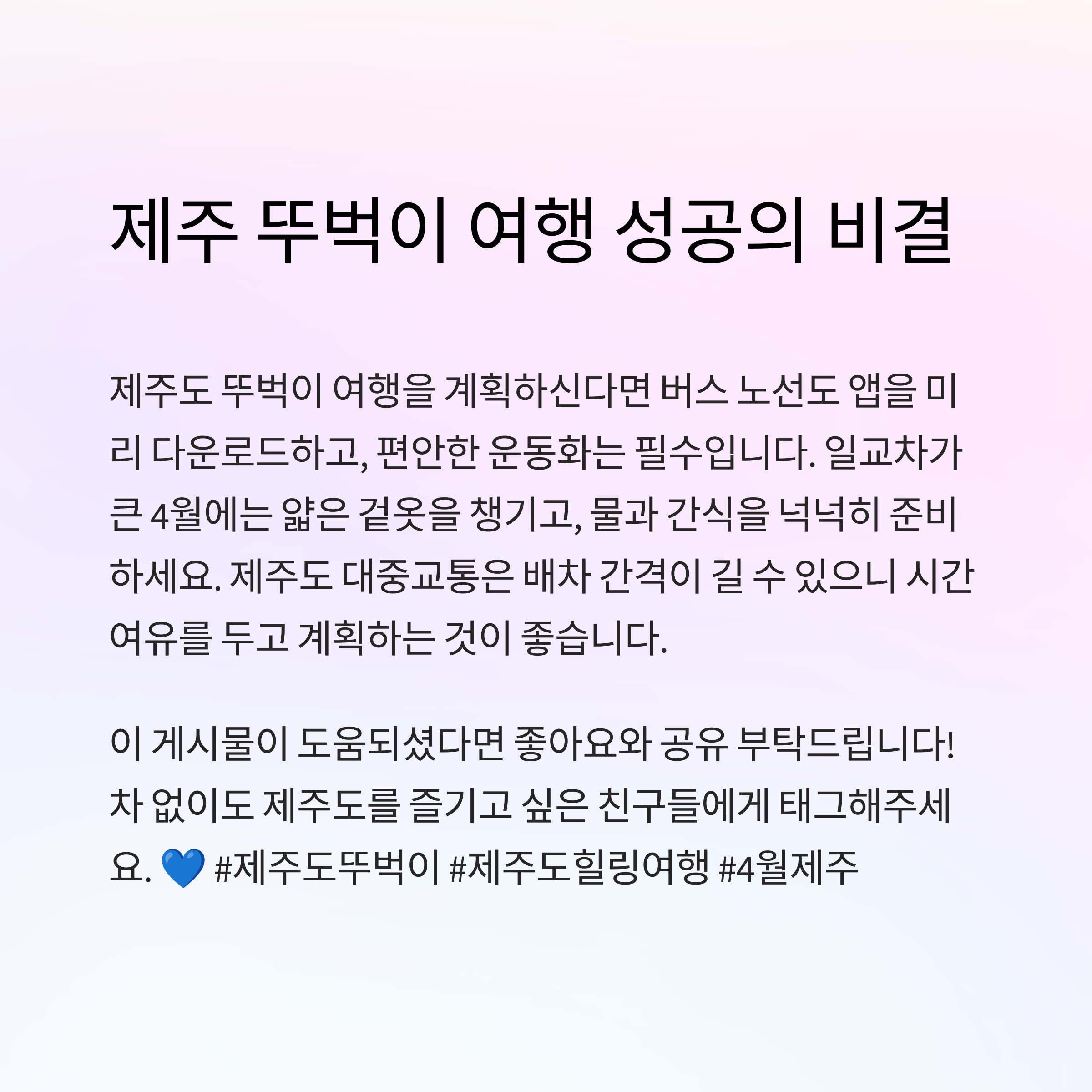 제주도는 렌터카 없이도 충분히 아름다운 여행지입니다. 도보 여행을 통해 자연을 더 가까이에서 느끼고, 그 속에 깃든 여유와 위로를 만끽할 수 있습니다. 특히 4월은 날씨가 따뜻하고 바람도 부드러워 걷기에 최적입니다. 오늘 소개드린 코스들을 참고해 일정에 맞게 조절하고 자신만의 감성 루트를 계획해보세요. 뚜벅이 여행은 단순한 이동이 아닌, 자연과의 교감이자 스스로를 위한 시간입니다. 이번 제주 여행이 여러분에게도 깊은 힐링이 되기를 바랍니다.