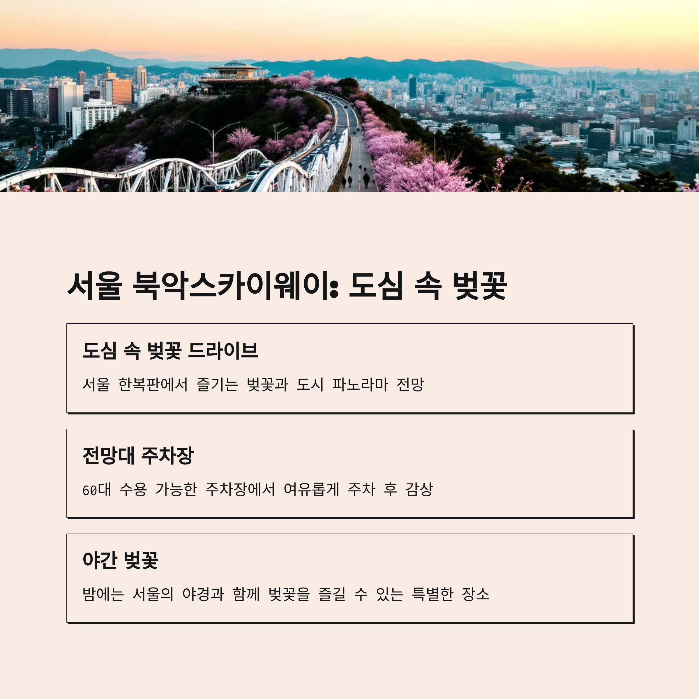 | 서울 북악스카이웨이 | 서울 전망과 벚꽃을 동시에 즐길 수 있는 도심 드라이브 코스입니다. |
