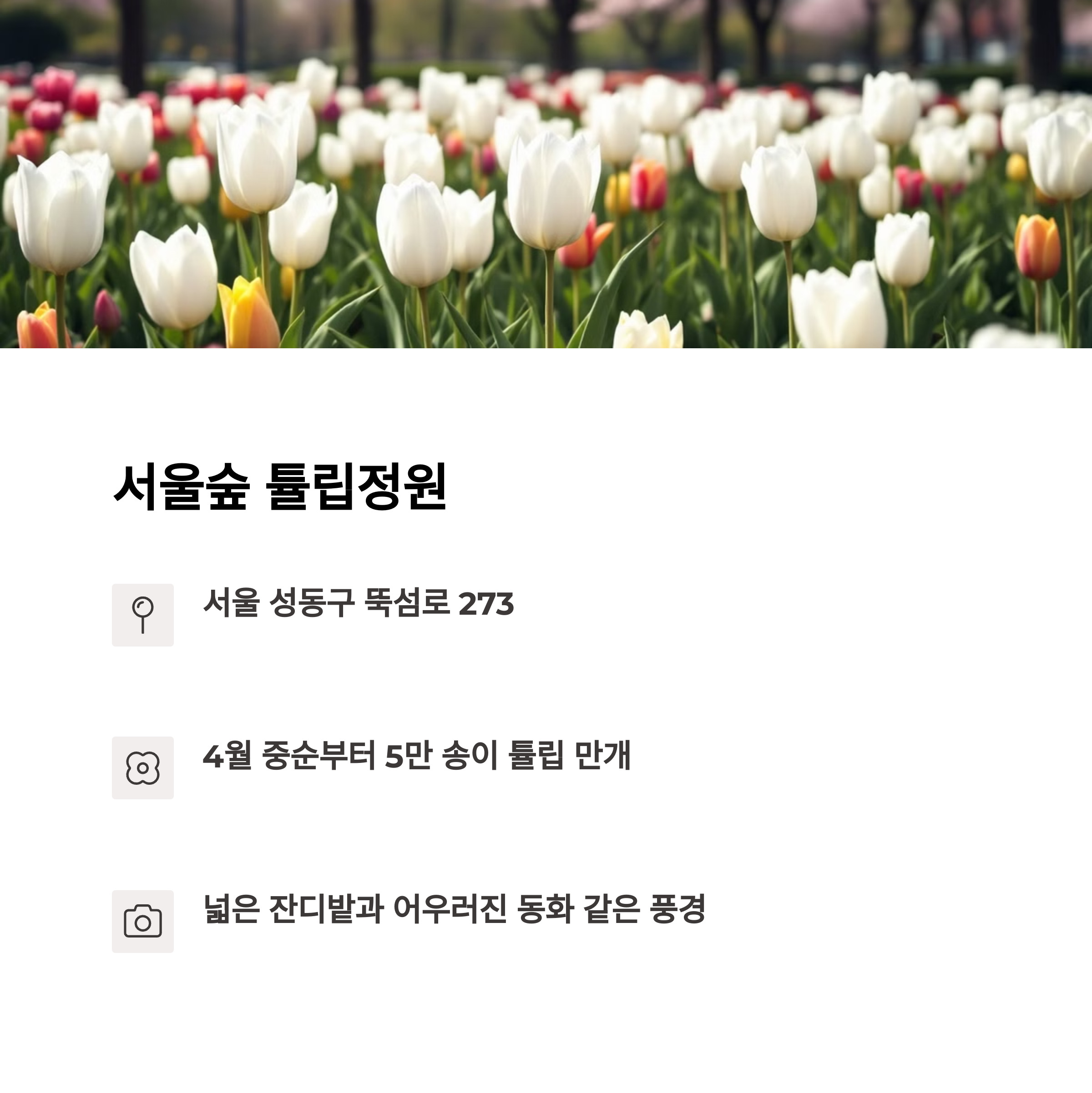 | 서울튤립 명소 | 서울숲에서 형형색색 튤립을 감상할 수 있어요 |
