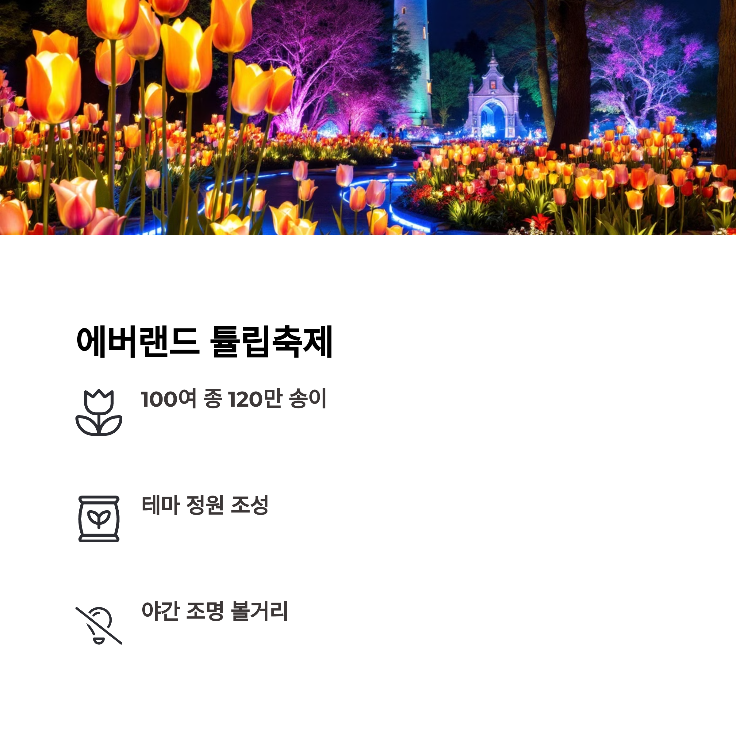 | 도심 속에서 즐기는 화려한 튤립 산책 | 낮과 밤이 모두 아름다운 봄꽃 축제 | 전국 최대 규모의 튤립 감상 명소 |