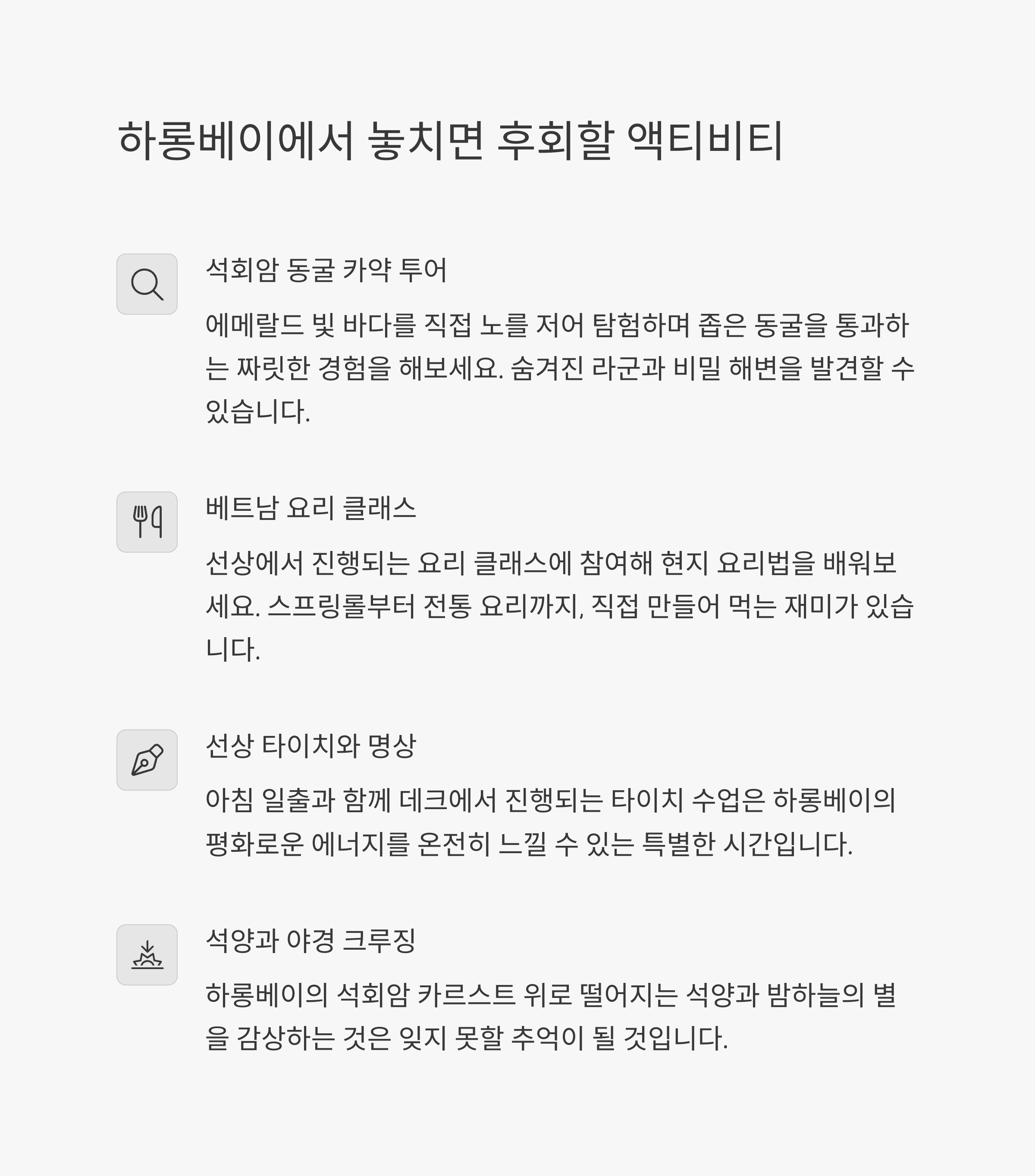 하롱베이 크루즈를 경험하신 분들의 이야기를 듣고 싶어요! 여러분이 다녀온 코스나 추천하고 싶은 크루즈가 있다면 댓글로 남겨주세요. 여러분의 경험이 다른 여행자들에게 큰 도움이 됩니다.