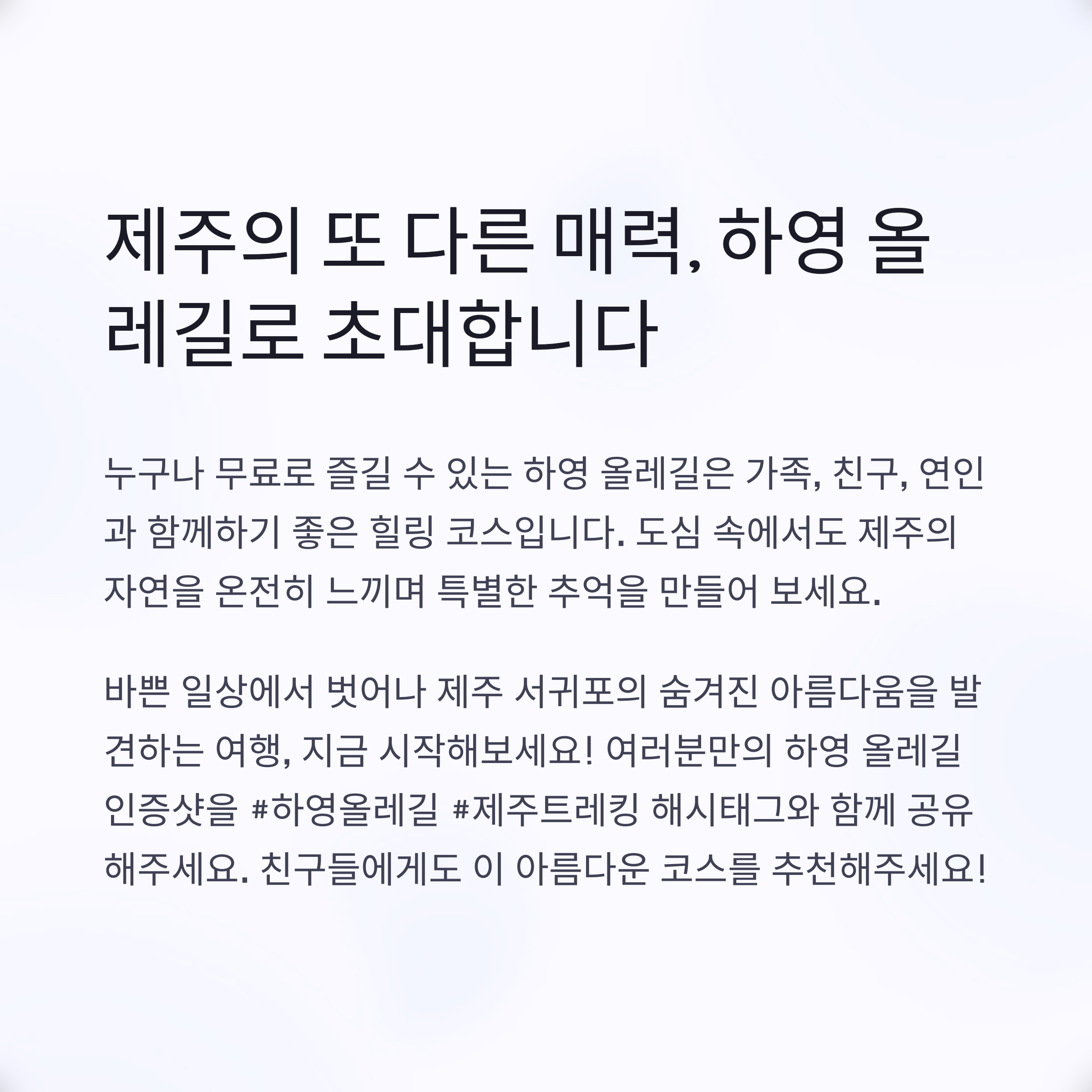 하영 올레길은 도심형 트레킹이지만 여느 산책로와는 달리 제주스러움이 가득 담긴 특별한 길입니다. 시간이 많지 않은 여행자, 도보로 둘러보고 싶은 분에게 특히 추천할 수 있으며, 서귀포의 일상적인 매력을 걷는 발걸음마다 자연스럽게 느낄 수 있습니다. 관광지뿐만 아니라 지역 주민의 삶이 녹아든 길이라 더욱 따뜻하고, 올레길이 가진 원래의 철학과도 맞닿아 있는 점이 인상 깊습니다. 제주의 새로운 모습을 만날 준비가 되셨다면, 오늘 바로 하영 올레길로 떠나보세요.