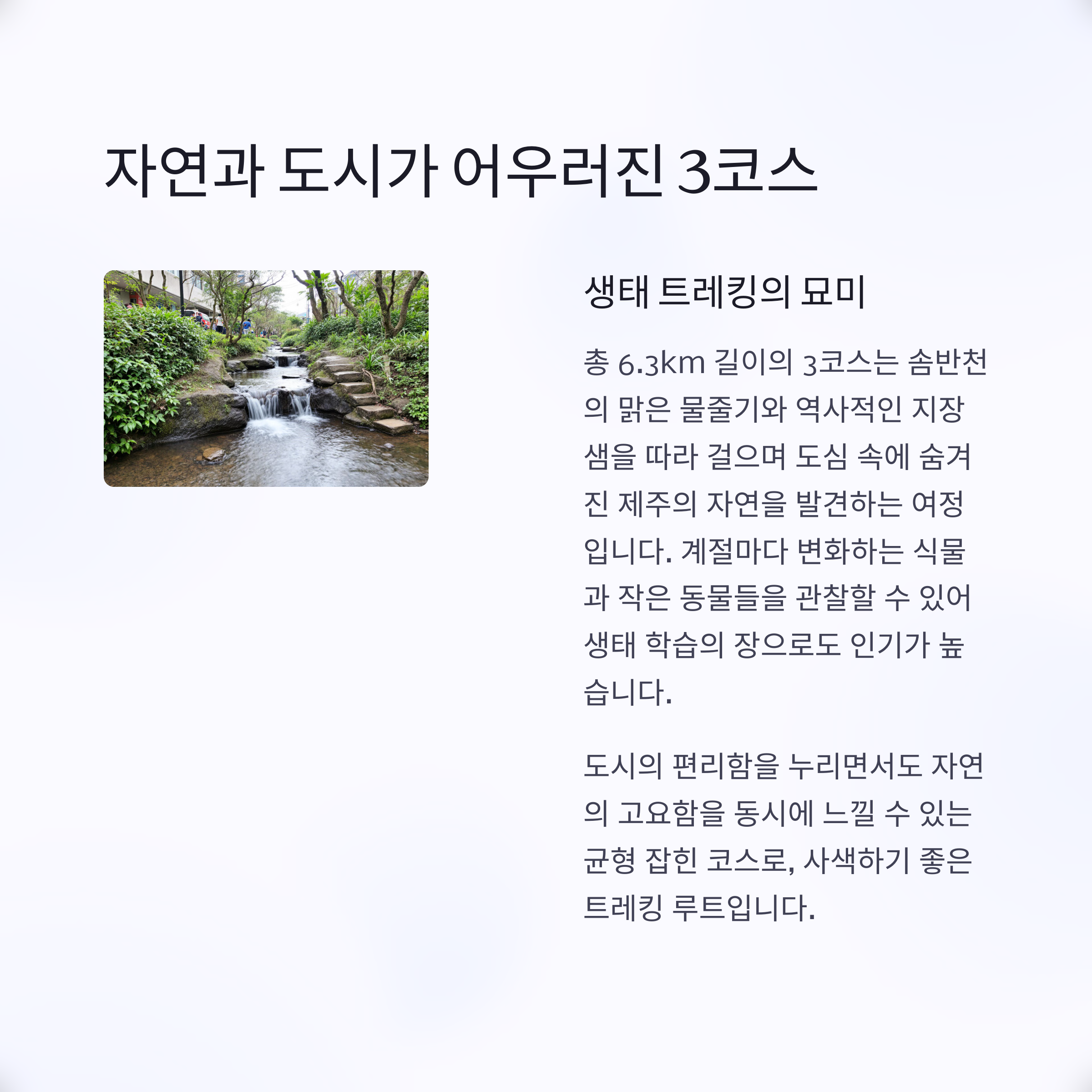 | 자연과 도심이 공존하는 순환형 코스 | 초보자도 즐길 수 있는 짧은 거리 구성 | 천지연폭포, 새연교, 시장까지 한 번에! |