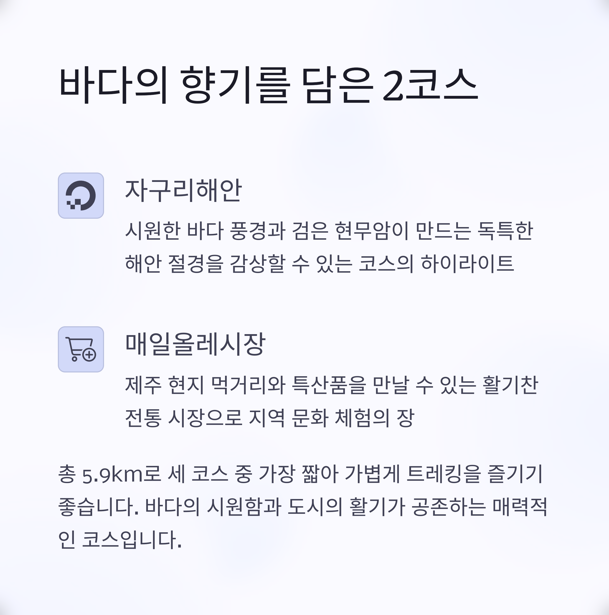 | 리본 표식으로 길 안내가 쉬움 | 서귀포 지역 매력을 제대로 느낄 수 있음 | 도심형 올레길로 여행 동선이 효율적임 |