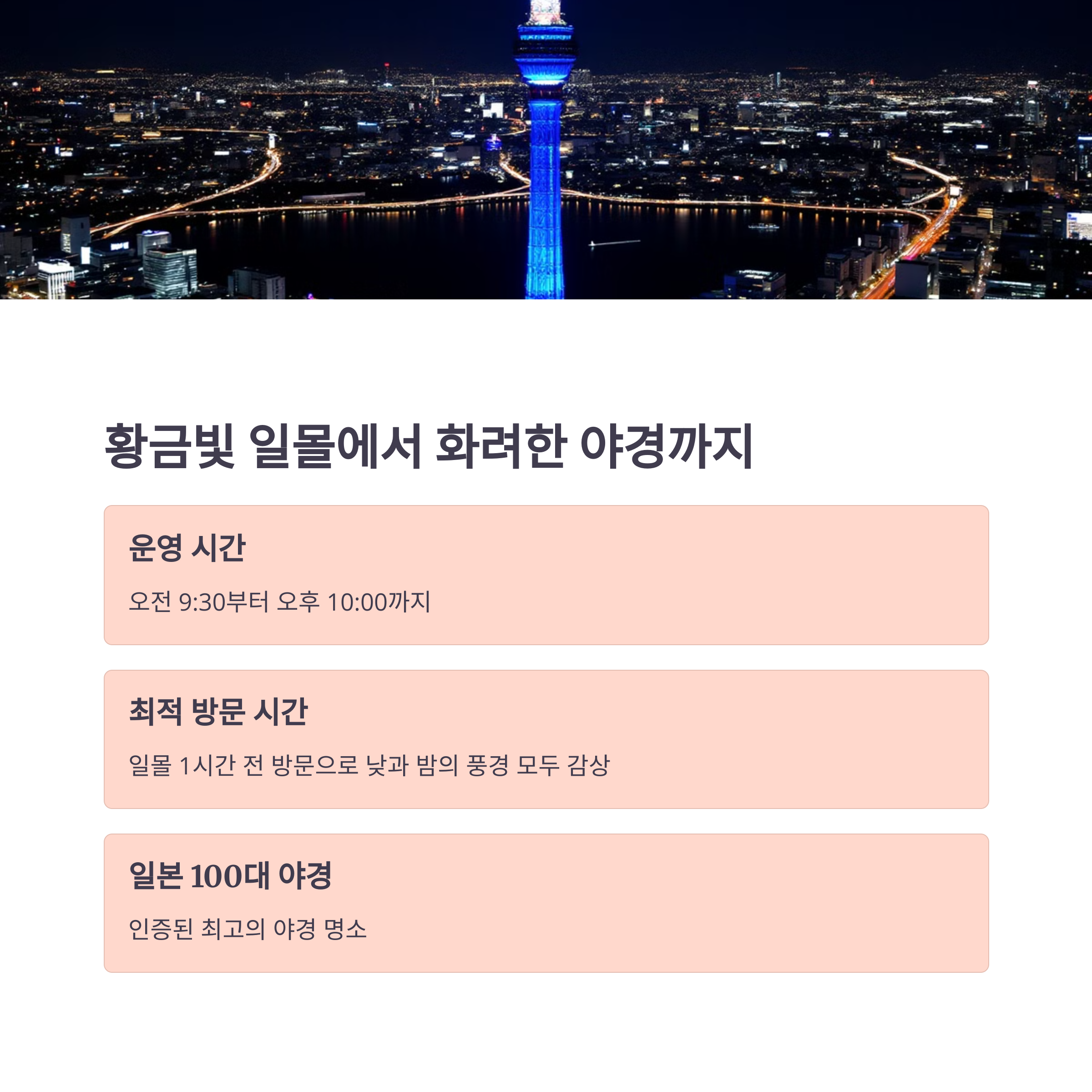 입장료는 성인 기준 800엔으로, 웹사이트 또는 앱을 통한 사전 예약 시 소정의 할인 혜택이 제공됩니다. 운영시간은 오전 9시 30분부터 오후 10시까지이며, 마지막 입장은 오후 9시 30분까지 가능합니다. 특히 일몰 시간대에는 석양과 야경을 동시에 감상할 수 있어 가장 인기가 많습니다. 야경은 일본 100대 야경 중 하나로 선정될 만큼 빛의 조화가 아름다워 많은 연인들과 가족 단위 여행객들이 찾는 명소입니다.