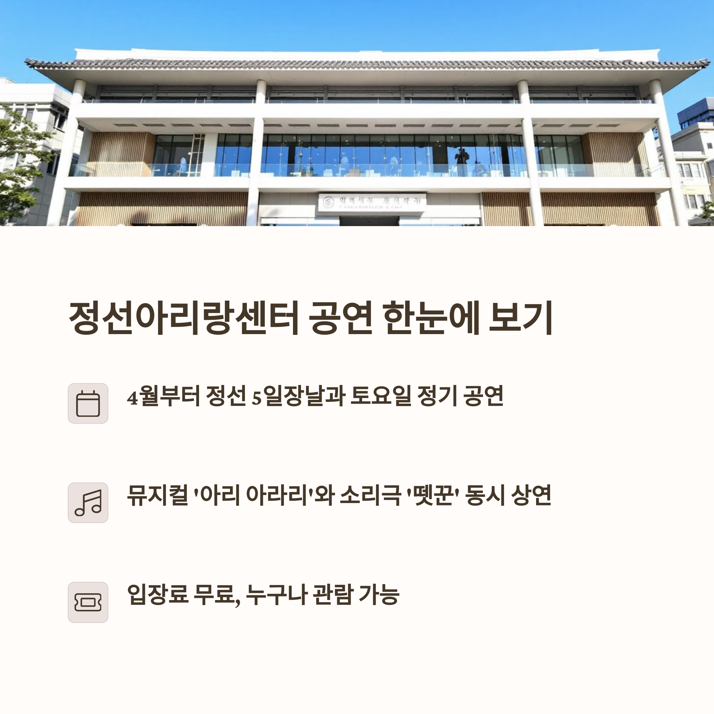 | 정선 아리랑 공연 | 4월부터 아리랑홀에서 상설공연 무료 운영 |